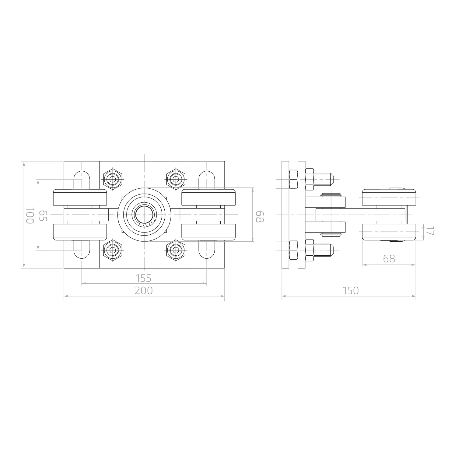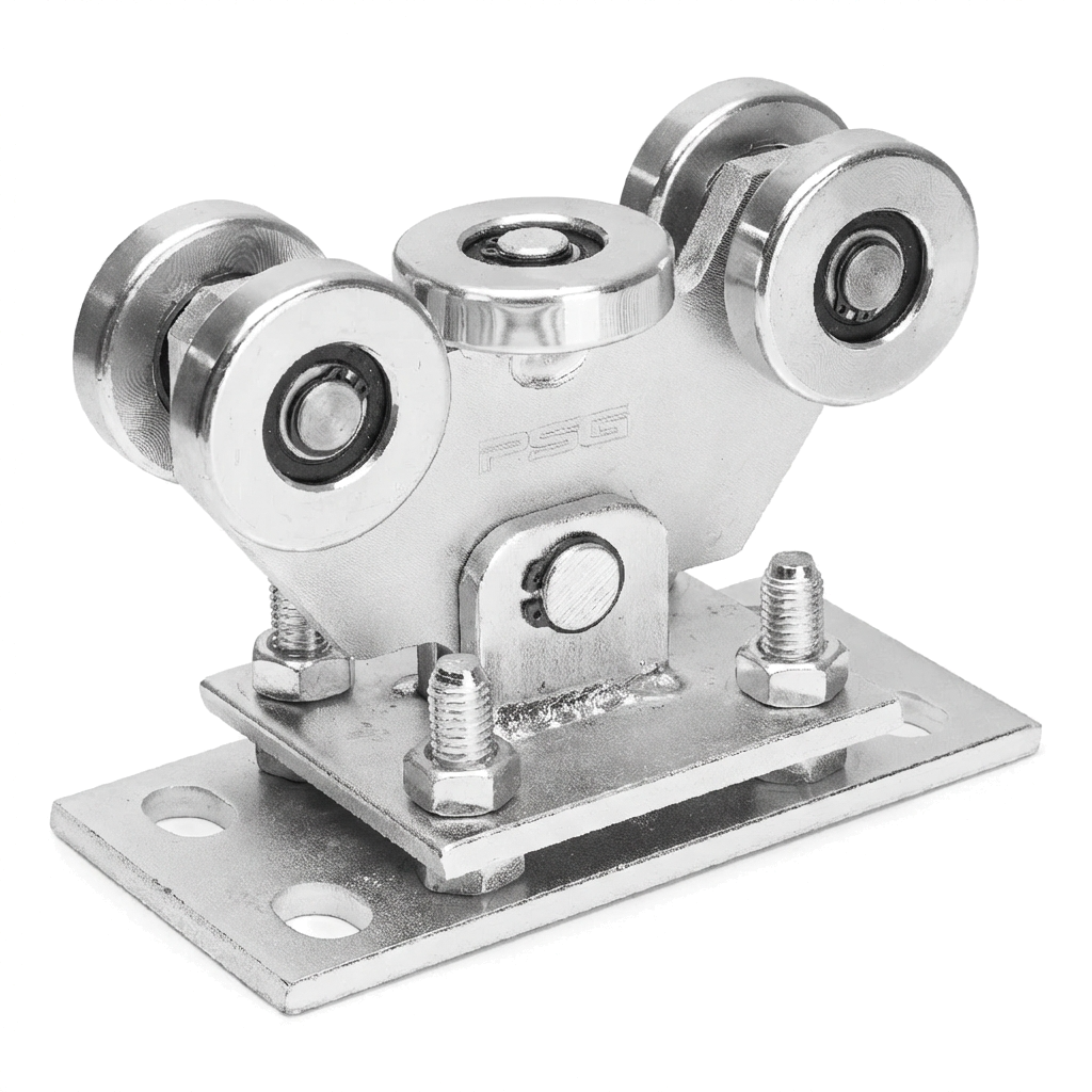 Vozík je vybavený 5 kovovými valčekmi, vrátane jedného horizontálneho valčeka stabilizujúceho vedenie brány. Kyvná konštrukcia — vozík je spojený so základňou pomocou čapu, vďaka čomu sa automaticky prispôsobuje koľajnici posuvnej brány. Výšková regulácia sa vykonáva pomocou skrutiek, čo umožňuje presné nastavenie úrovne brány počas montáže.