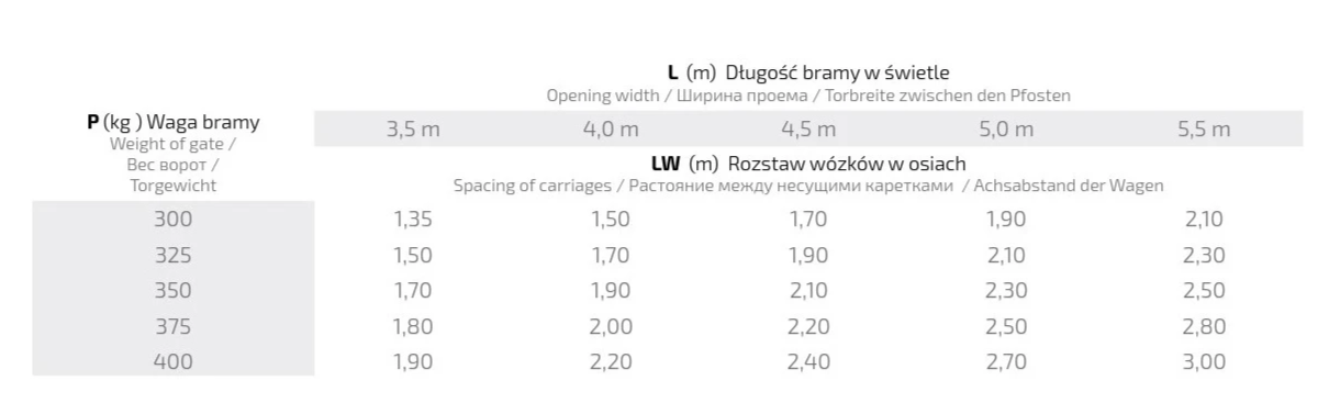 Správny rozostup vozíkov v osiach závisí od hmotnosti brány a svetlej šírky brány. Nasledujúca tabuľka uľahčuje výber: