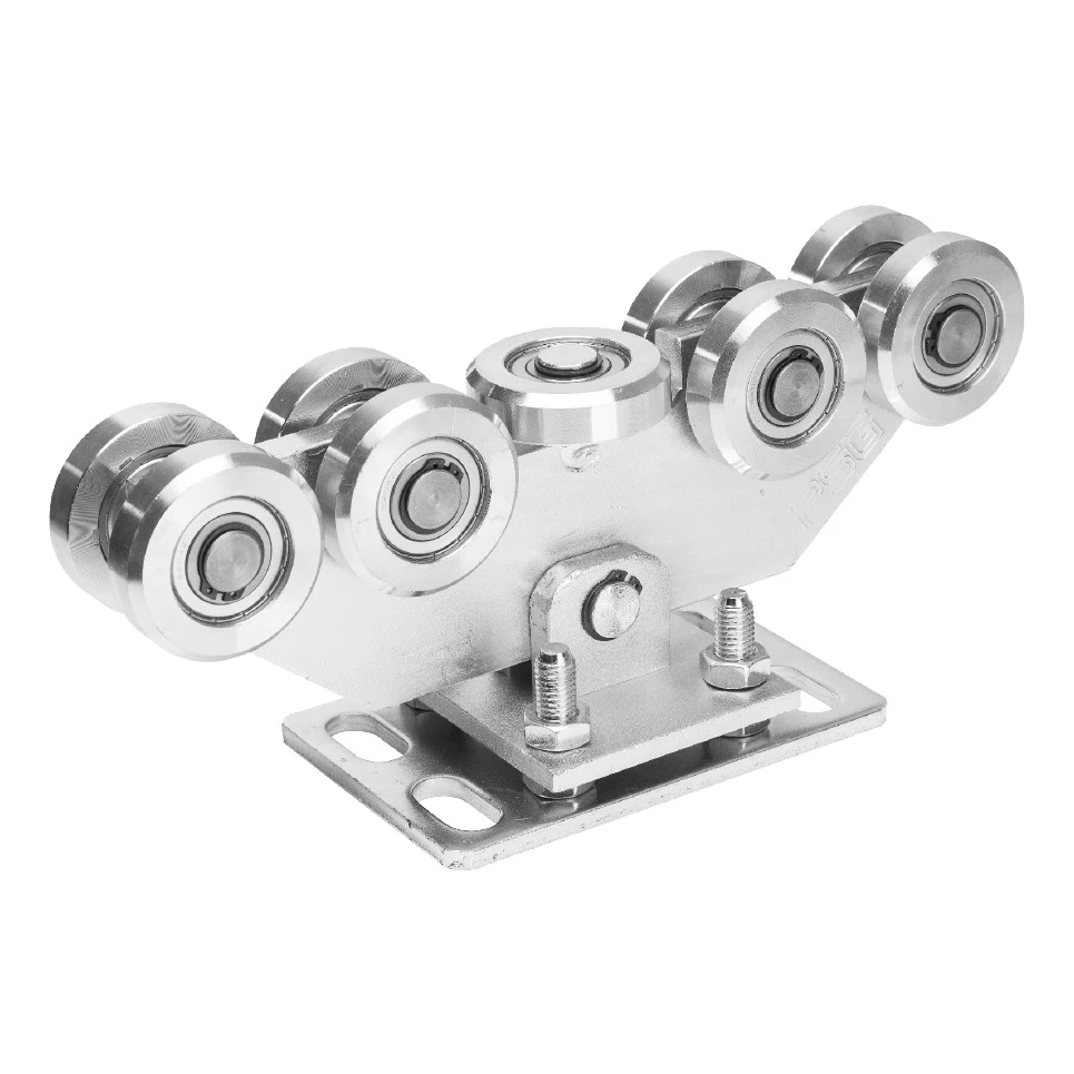 Jazdný vozík vybavený 9 oceľovými valčekmi s ložiskami zabezpečuje mimoriadne plynulý a tichý pohyb brány. Konštrukcia s výškovou reguláciou pomocou skrutiek umožňuje presné nastavenie brány voči vodorovnej rovine, čo vedie k rovnomernému rozloženiu záťaže a menšiemu opotrebovaniu valčekov. Každý vozík je prispôsobený pre koľajnicu s rozmermi 80×80×5 mm a vydrží zaťaženie až 1 000 kg.