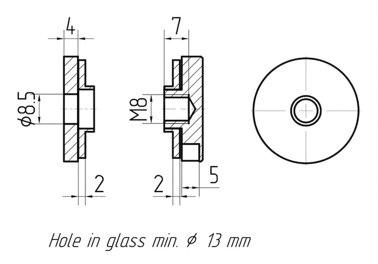 Držiak je určený na sklá s hrúbkou od 4 mm do 16,76 mm (vrátane laminovaného skla VSG). Minimálny priemer montážneho otvoru v skle je ø 13 mm. Vďaka univerzálnemu závitu M8 sa prvok ľahko integruje s typickými systémami nerezových zábradlí montovaných na steny, stĺpiky a ploché konštrukcie.