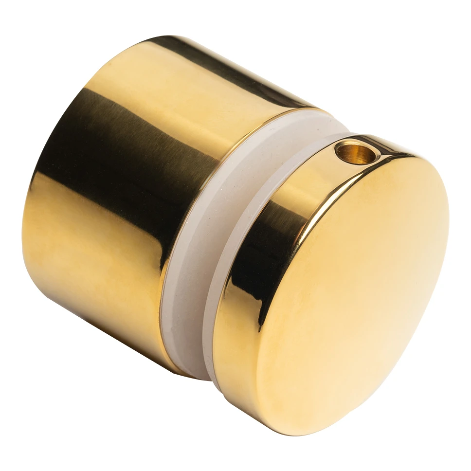 Zlatý bodový držiak na sklo Ø50 mm z nehrdzavejúcej ocele AISI 304 s PVD vrstvou v lesklom prevedení — profesionálny upevňovací prvok pre sklené tabule s hrúbkou od 8 do 21,52 mm. Určený na montáž na ploché povrchy, zabezpečuje stabilné a estetické upevnenie skla ako vo vnútri budovy, tak aj vonku.