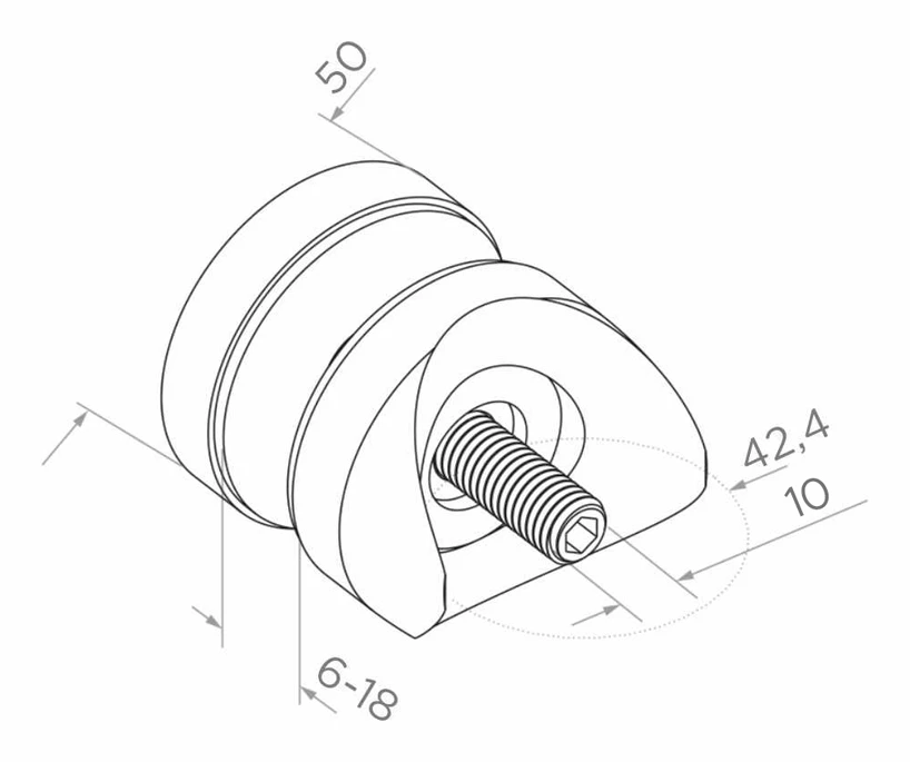 Bodový úchyt na sklo s priemerom 50 mm vyrobený z nehrdzavejúcej ocele AISI 304 v saténovom prevedení. Určený na upevnenie sklenených tabúľ s hrúbkou od 8 do 17,52 mm na okrúhlu rúru s priemerom 42,4 mm. Vďaka použitiu kyselinovzdornej ocele sa úchyt osvedčuje ako vo vnútri budov, tak aj vonku — pri zábradliach terás, balkónov, schodiskových priestoroch a sklenených striešok.