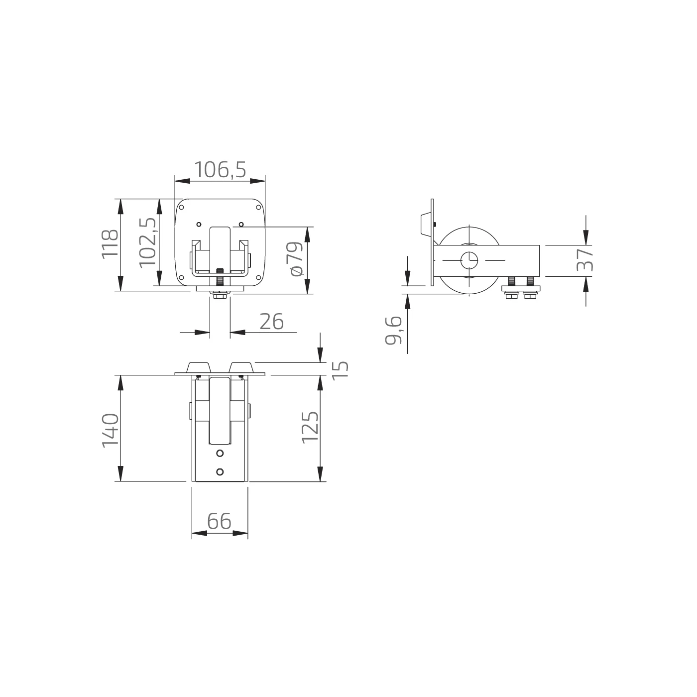 Telo vyhotovené z pozinkovanej ocele zaručuje vysokú odolnosť proti korózii aj v náročných poveternostných podmienkach, a nylonové koliesko s priemerom ø79 mm zabezpečuje tichú a bezporuchovú prevádzku po mnohé roky používania. Kompaktné rozmery a hmotnosť len 1,25 kg minimalizujú zaťaženie konštrukcie brány a uľahčujú montáž.
