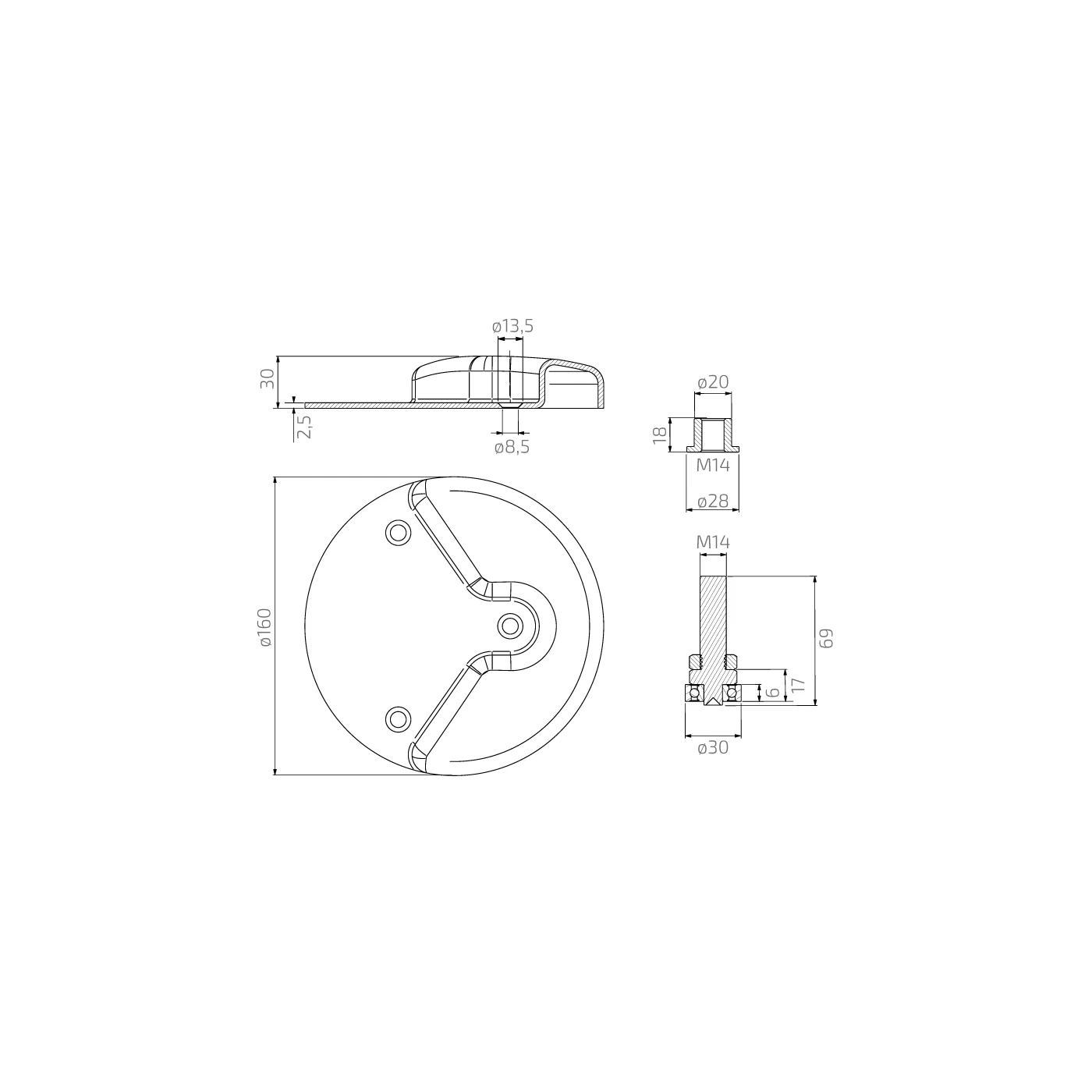 V súprave: doska nárazníka okrúhla ø160 mm + montážny čap so závitovým púzdrom M14.