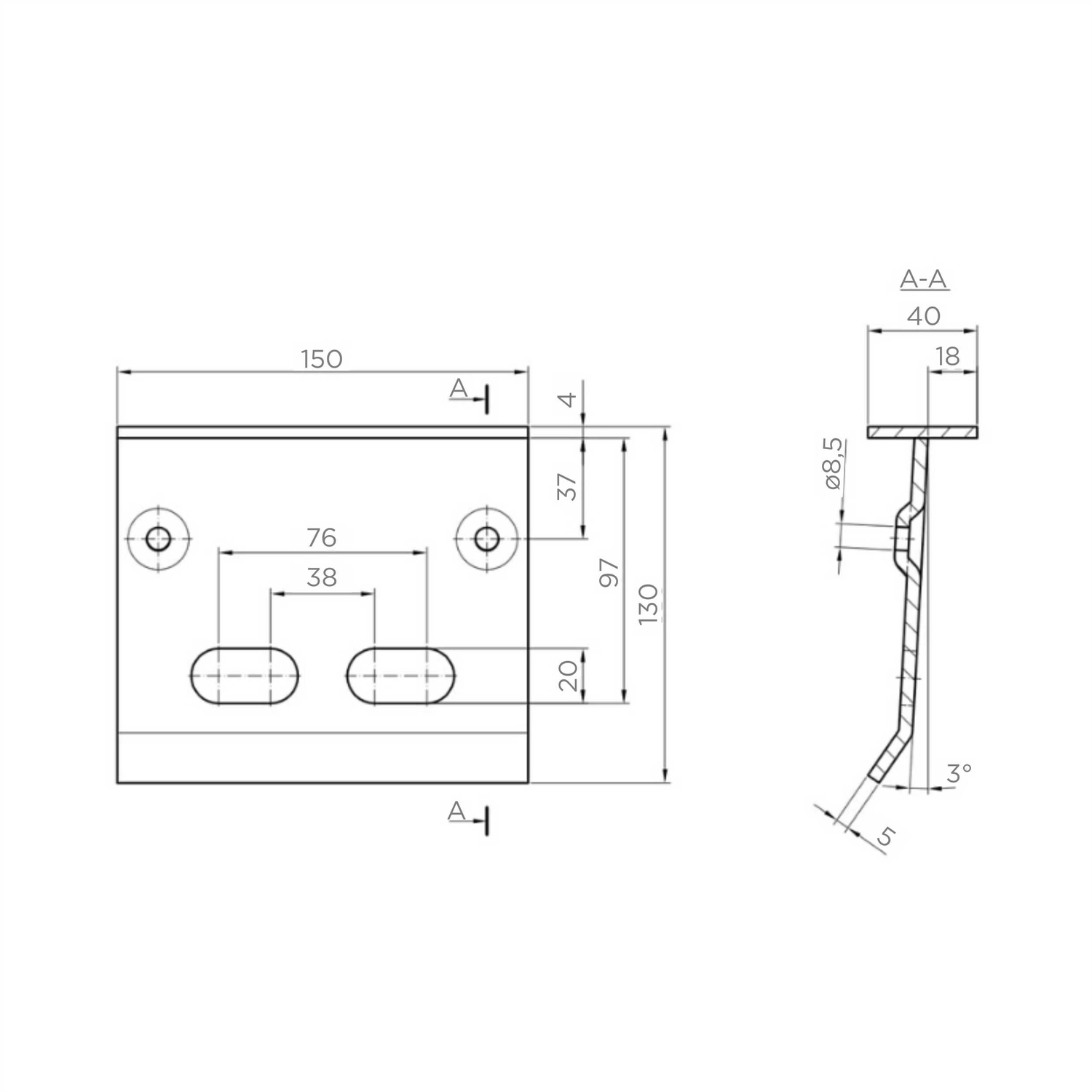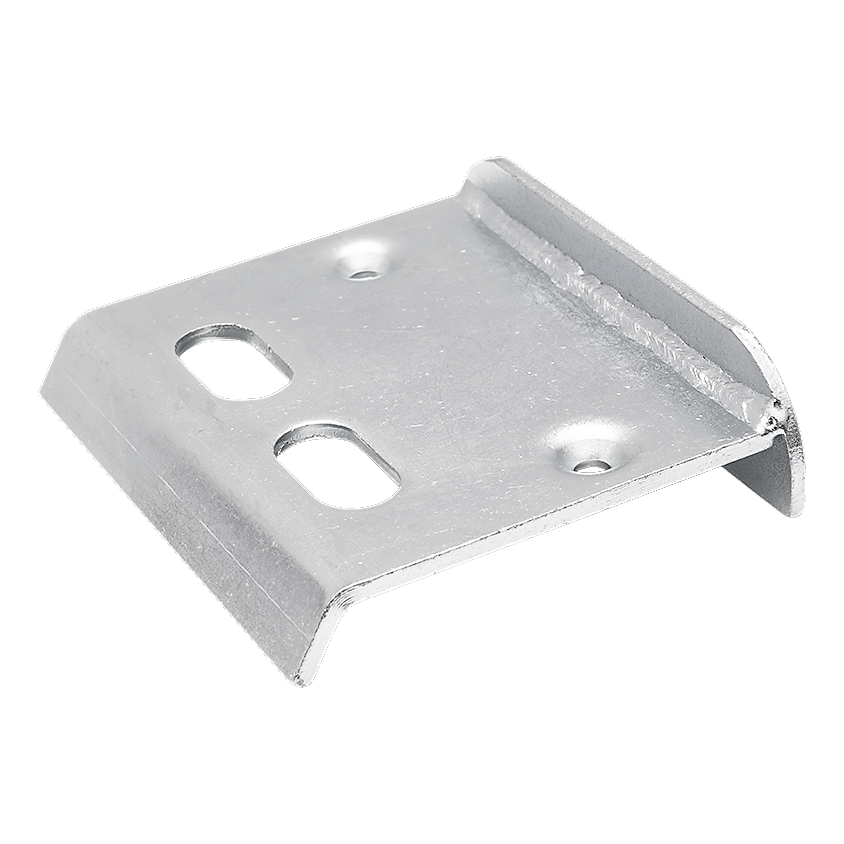 Pevná konštrukcia z oceľového plechu s hrúbkou 5 mm zaručuje mechanickú trvanlivosť, a premyslený profil so záhybmi zabezpečuje tuhosť a stabilitu po montáži. Dva okrúhle otvory (Ø 8,5 mm) slúžia na priskrutkovanie dorážnika k podlahu, zatiaľ čo dva fazuľkové otvory umožňujú montáž závory s možnosťou regulácie polohy.