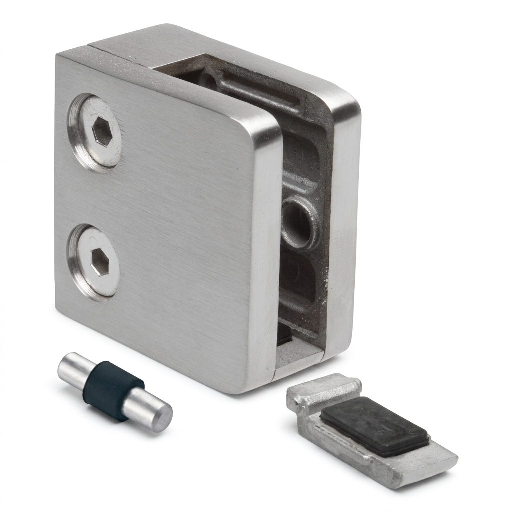 Držiak je určený na zaskrutkovanie do podkladu. Súčasťou sady je konzola (tlačná vložka) a zabezpečovací pin, ktorý stabilizuje sklo v držiaku a zabraňuje jeho náhodnému posunutiu. Dve imbusové skrutky umožňujú presnú reguláciu pritlačenia bez nutnosti demontáže celého držiaka — výrazne to urýchľuje montážne práce na stavbe.