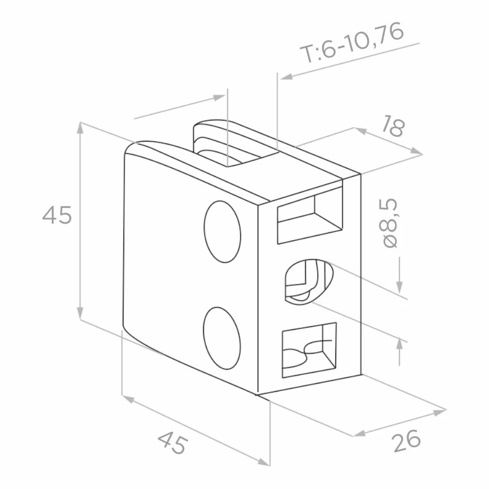 Držiak skla 45×45×26 mm s konzolou a zabezpečovacím pinom — spoľahlivé montážne riešenie na uchytenie sklenených panelov s hrúbkou od 6 do 10,76 mm. Vyrobený z nehrdzavejúcej ocele AISI 304 s leštením (zrkadlový povrch), zaručuje estetický vzhľad a vysokú odolnosť voči korózii. Určený na montáž na rovné povrchy — vhodný pre zábradlia, kryty a sklenené príčky.