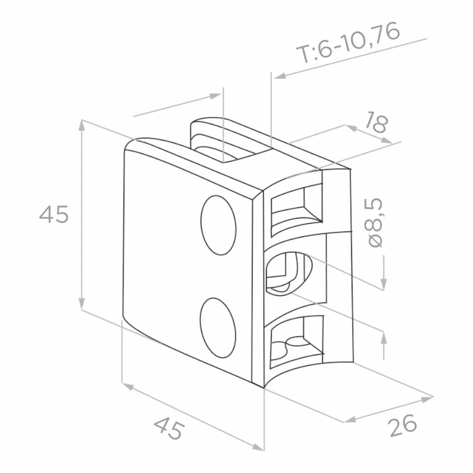 Štvorcový držiak skla 45×45×26 mm určený pre systémové sklenené a celosklené zábradlia. Vyrobený zo zamaku s hrubým povrchom, zabezpečuje stabilné a estetické uchytenie sklenených tabúľ s hrúbkou od 6 do 10,76 mm. Držiak je kompatibilný so systémovými rúrkami Ø 42,4 mm a montuje sa skrutkovaním, čo umožňuje rýchlu a opakovateľnú montáž na stavenisku.