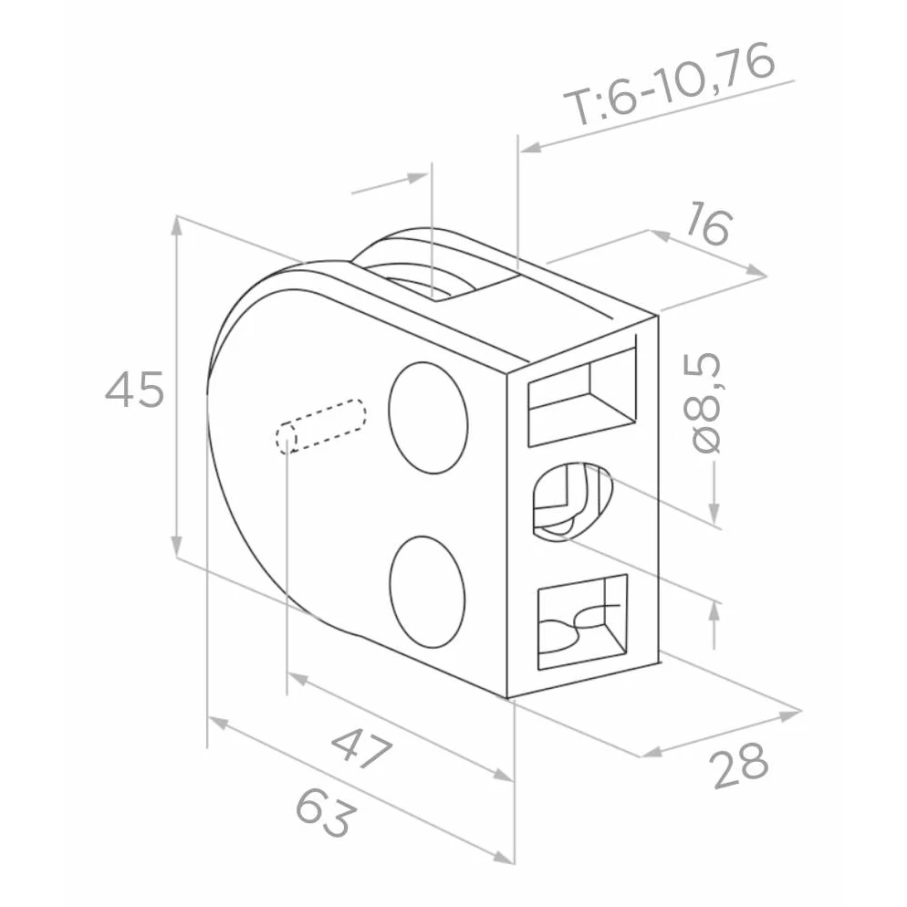 Zaoblený držiak skla s rozmermi 63×45×28 mm, určený na montáž sklenených tabúľ s hrúbkou od 6 do 10,76 mm na plochých povrchoch. Vyrobený z nehrdzavejúcej ocele AISI 304 so saténovou úpravou — ideálna voľba pre elegantné sklenené zábradlia, interiérové zabudovania a systémy priečok v komerčných aj rezidenčných objektoch.
