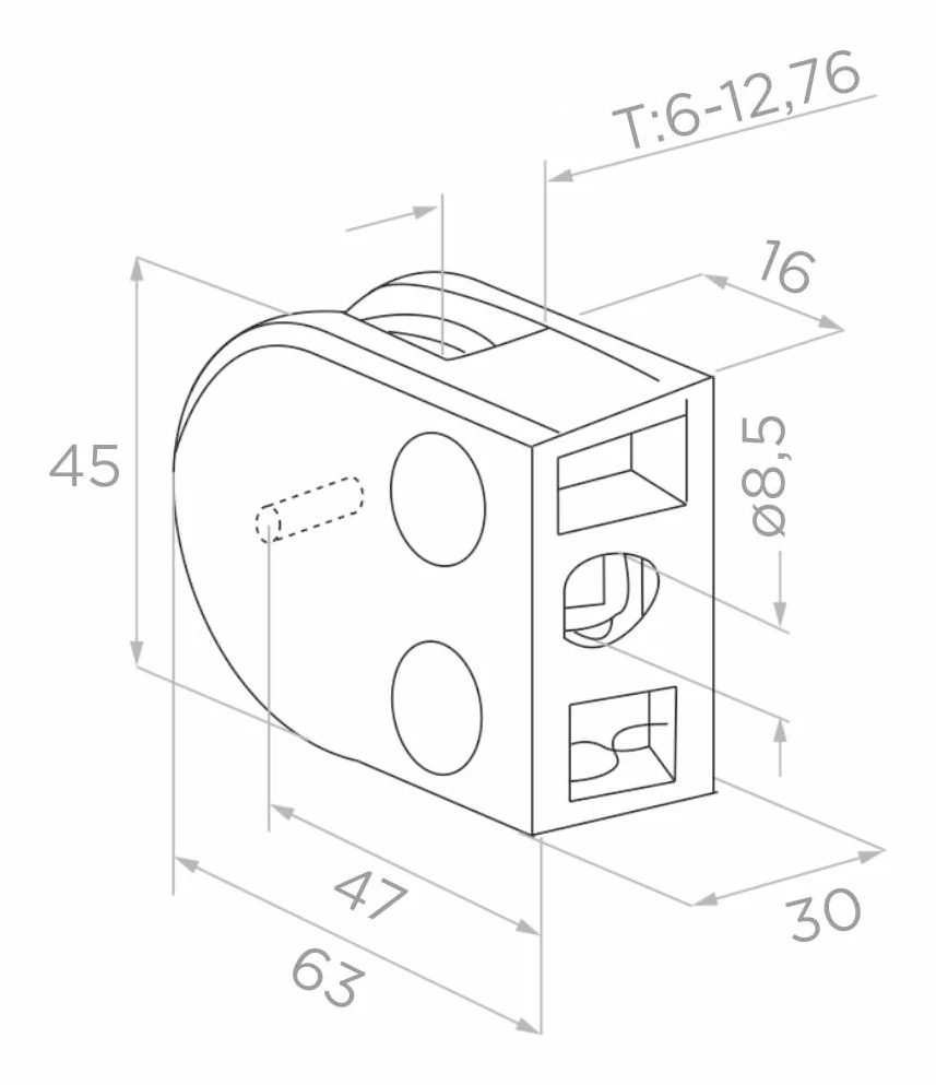 Zaoblený držiak skla určený pre systémové sklenené a celosklené zábradlia. Slúži na stabilné uchytenie sklenených tabúľ s hrúbkou od 6 do 12,76 mm a zabraňuje ich vysunutiu vďaka priloženému poisťovaciemu pinu. Vyrobený z nehrdzavejúcej ocele AISI 304 so saténovou povrchovou úpravou — je odolný voči korózii a výborne sa hodí na použitie vnútri aj vonku budov.