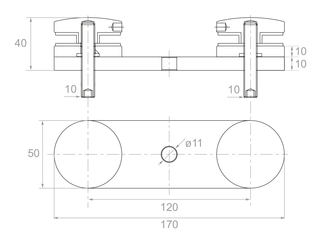 Dvojitý bodový držiak skla s priemerom fi 50 mm a dĺžkou 170 mm, určený na montáž sklenených tabúľ s hrúbkou od 8 do 21,52 mm do nerezových zábradlí. Zabezpečuje tuhosť konštrukcie a účinnú stabilizáciu sklenených výplní, pričom zachováva moderný, minimalistický vzhľad.
