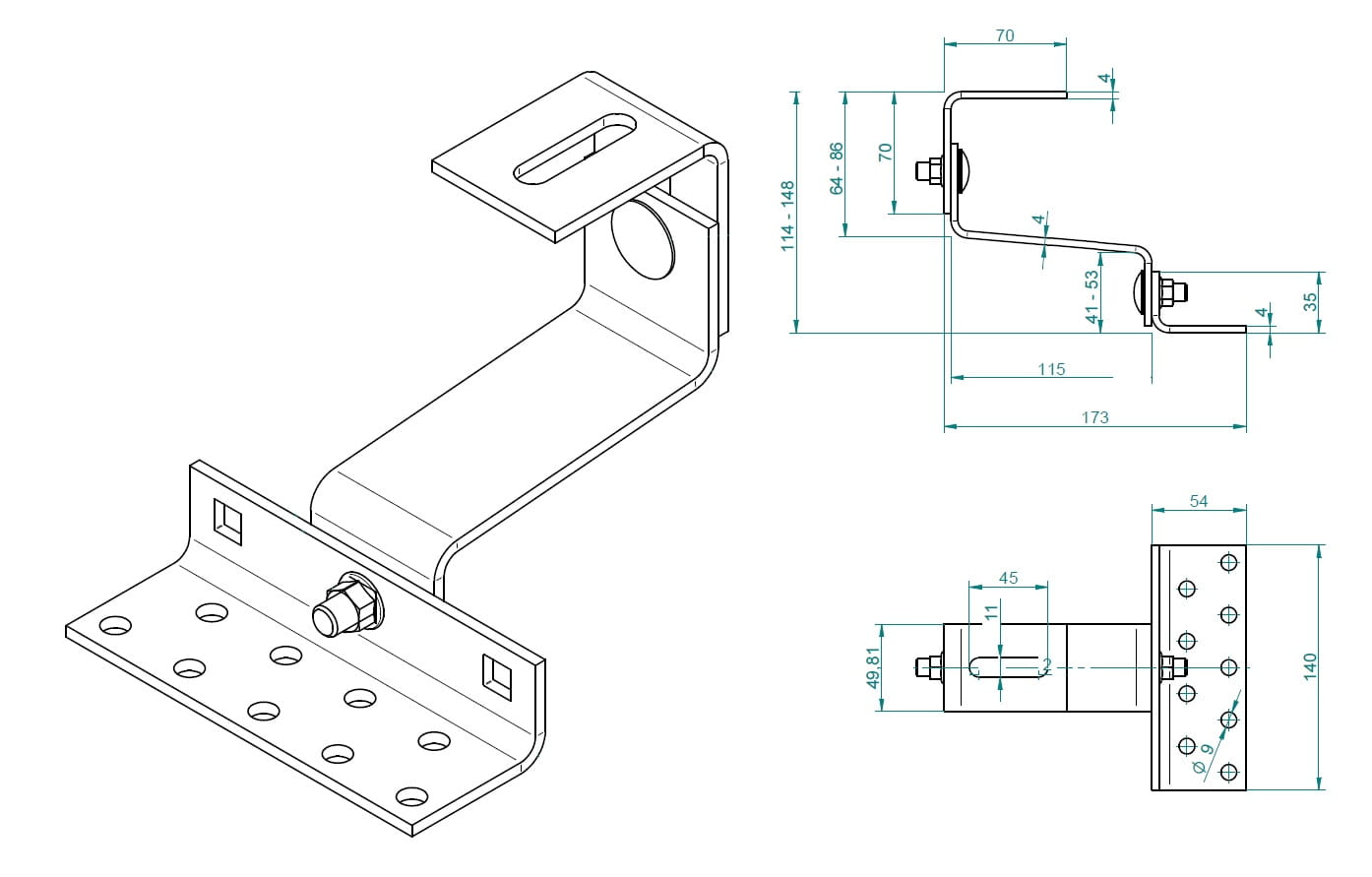 - Široká a nastaviteľná konzola je vyrobená z plechu hrúbky 4 mm a 5 mm, a zeta z plochej ocele 30x5 mm.