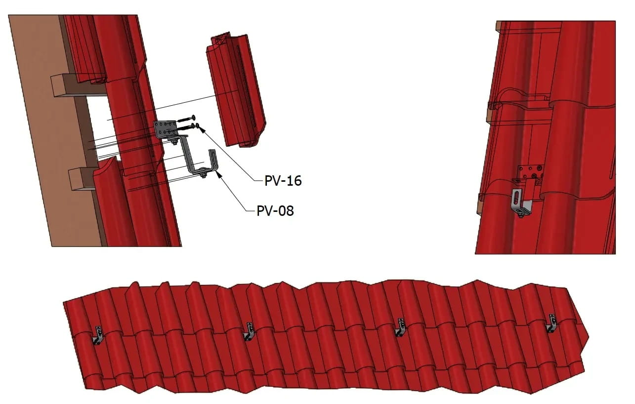 Strešný držiak na montáž nosných líšt fotovoltaických panelov na strechách pokrytých keramickou a betónovou škridlou. Zaručuje správnu stabilitu celej konštrukcie.