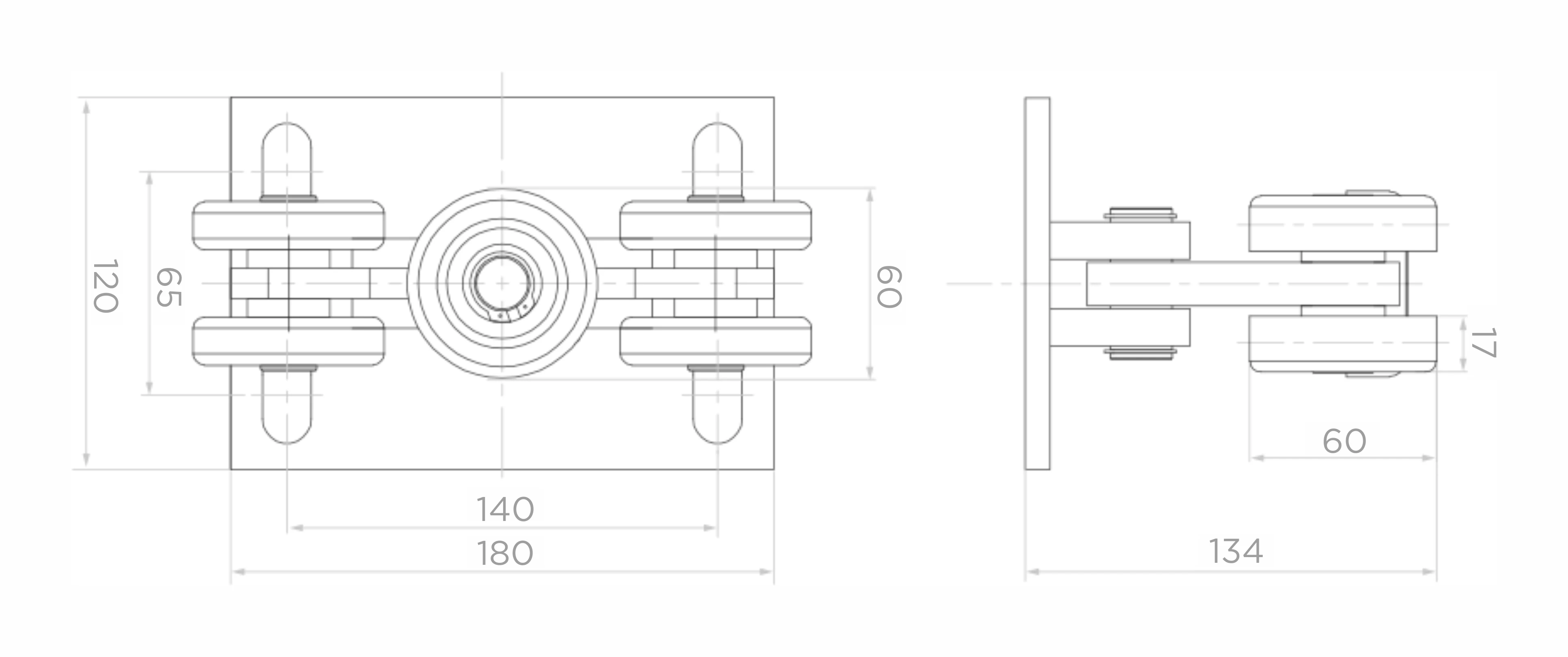 Základová doska má montážne otvory v tvare drážky, ktoré umožňujú nastavenie polohy vozíka počas inštalácie. Vďaka tomu môže inštalačná firma presne nastaviť polohu vozíkov voči koľajnici a krídlu brány, čo sa premieta do optimálnej funkcie celého posuvného systému.