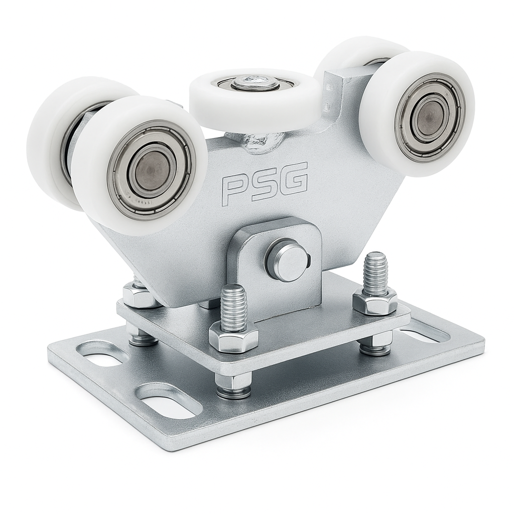 Jazdný vozík 70 je odolný, 5-kladkový jazdný prvok určený pre samonosné posuvné brány. Kyvná konštrukcia s čapom umožňuje automatické prispôsobenie sa vodiacej koľajnici, čo eliminuje napätia a zabezpečuje plynulý chod brány aj pri vysokom zaťažení – ideálne riešenie pre inštalatérov hľadajúcich spoľahlivé komponenty do systémov posuvných brán.