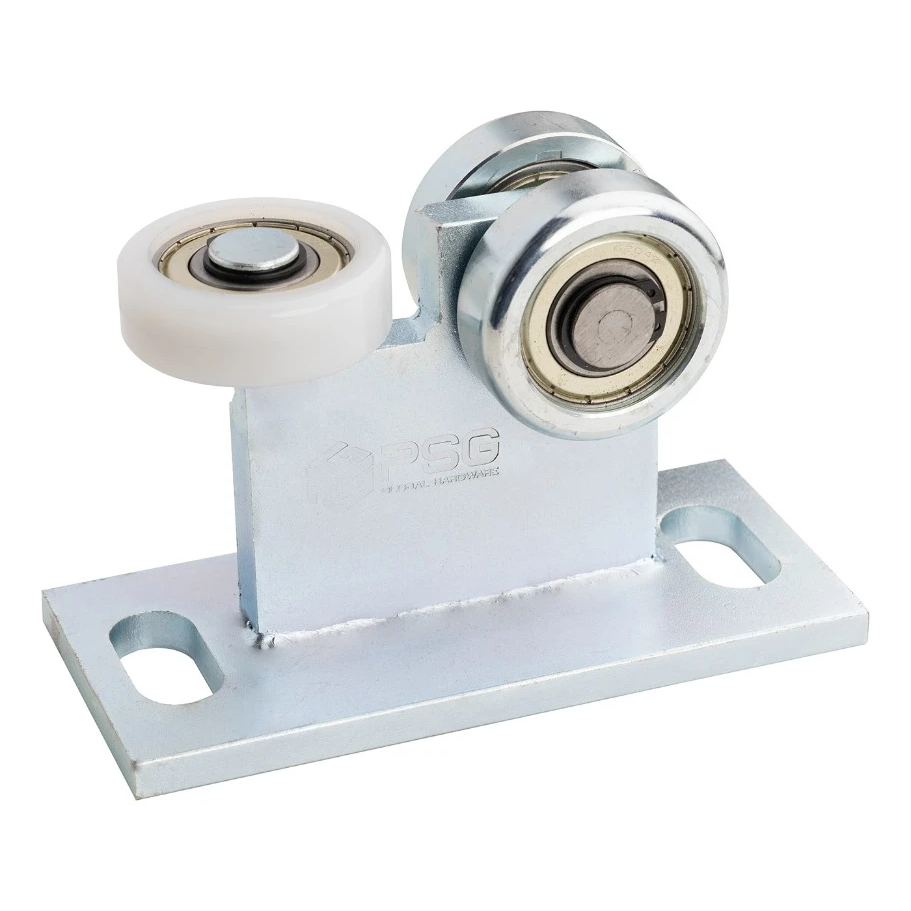 Nosné kladky sú uložené na ložiskách, čo zaručuje dlhodobú bezúdržbovú prevádzku a minimálne opotrebenie. Vodiaca plastová kladka plní stabilizačnú funkciu — udržiava vozík v osi koľajnice a eliminuje bočné vôle, pričom zároveň tlmí vibrácie a redukuje hluk.