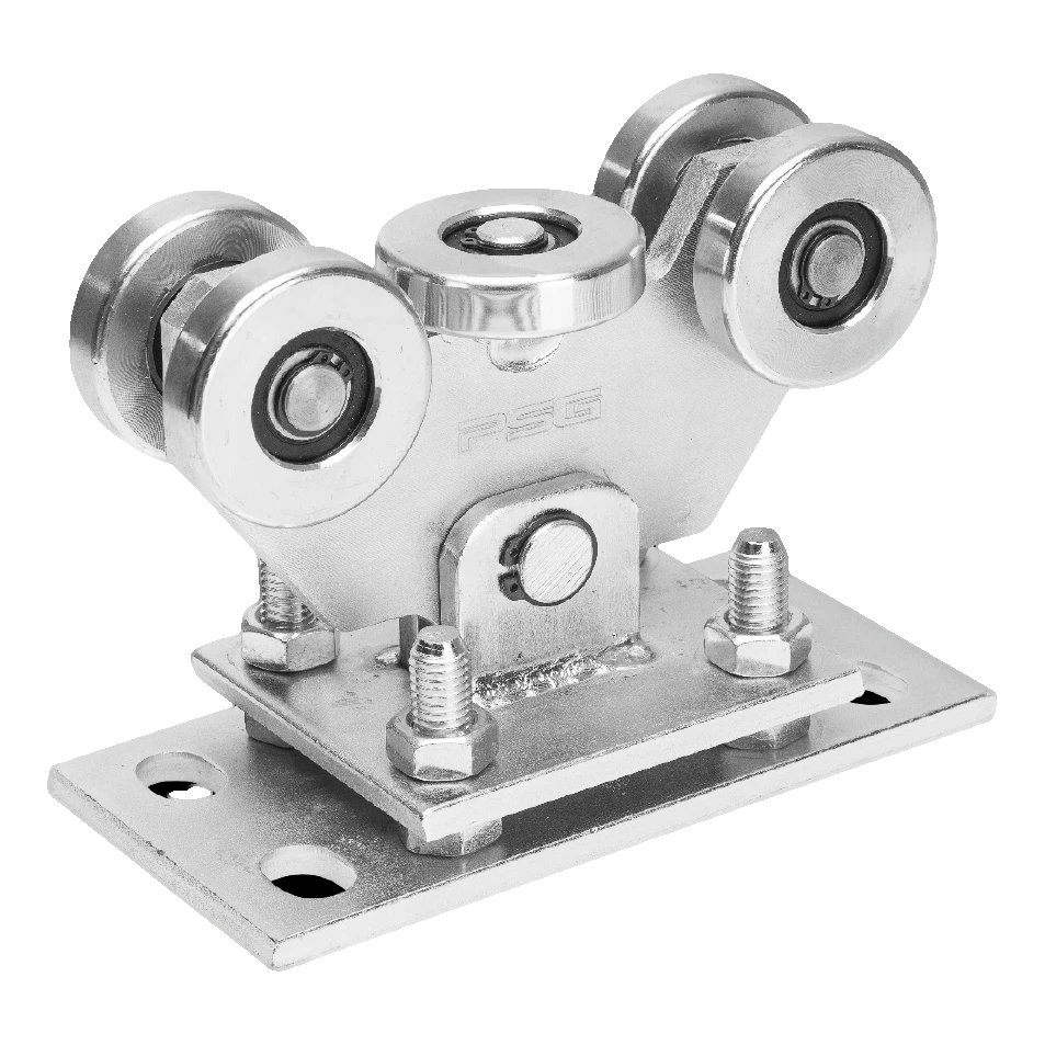 Jazdný vozík s 5 valčekmi pre samonosné posuvné brány — odolný jazdný prvok navrhnutý pre brány s vysokou hmotnosťou. Vďaka kyvnej konštrukcii sa vozík automaticky prispôsobuje polohe koľajnice, čo eliminuje napätia spôsobené nerovnosťami podkladu a zabezpečuje plynulú, bezporuchovú prevádzku brány po mnoho rokov používania.