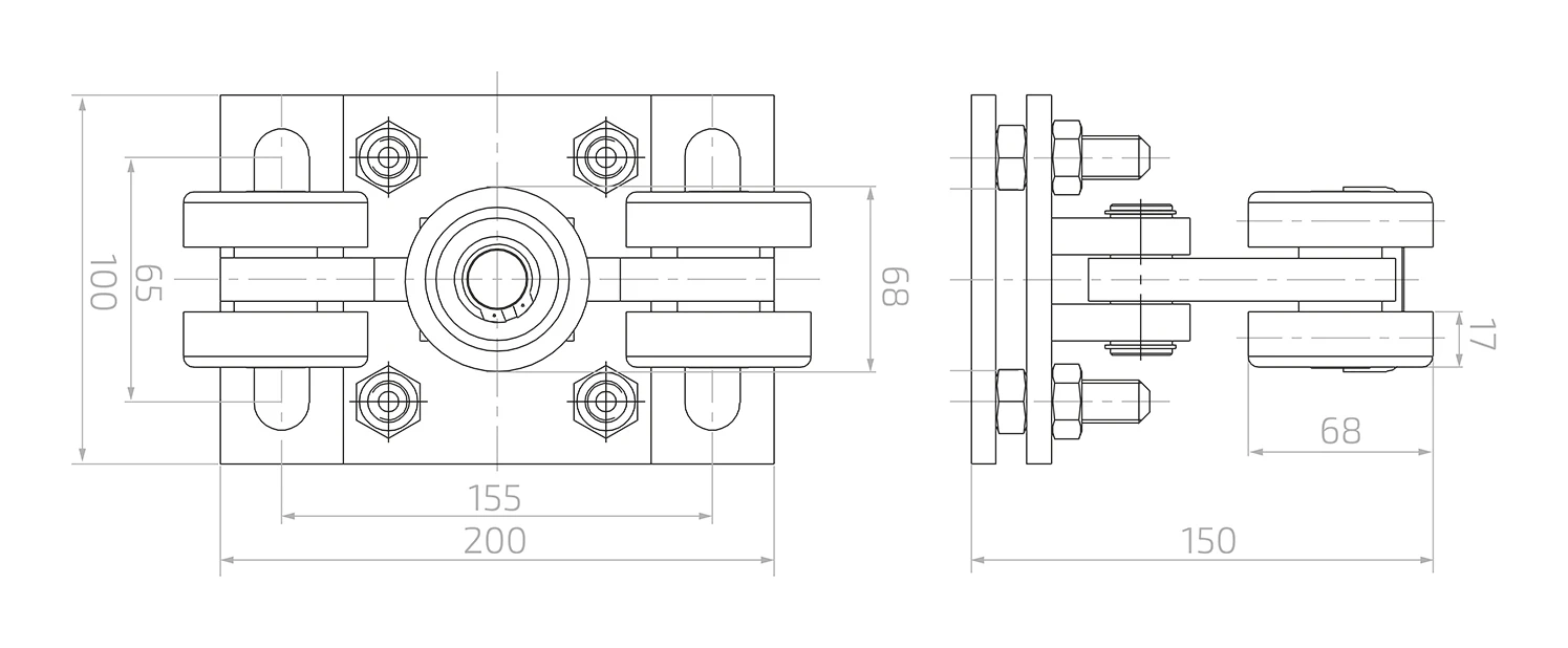 Vozík je vybavený 5 oceľovými valčekmi — štyri nosné valčeky usporiadané zvisle a jeden vodorovný valček plniaci funkciu vodiaceho prvku. Toto usporiadanie zabezpečuje stabilnú oporu koľajnice brány zdola aj zboku, čo sa prejavuje tichým chodom a minimálnym opotrebením jazdných prvkov. Korpus vozíka je spojený so základovou doskou pomocou kyvného čapu, vďaka čomu sa celý systém valčekov môže vychyľovať a kompenzovať prípadné montážne odchýlky. Regulácia výšky sa vykonáva pomocou skrutiek zaistených maticami — umožňuje presné nastavenie úrovne koľajnice voči stĺpikom brány bez potreby podkladania distančných prvkov.