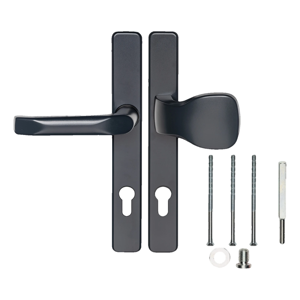 Antracitová kľučka na dvere so štítkom a gombíkom je kompletná sada určená na montáž v dverách vybavených zámkom s valčekovou vložkou. Kombinácia klasickej kľučky na vnútornej strane s ergonomickým gombíkom (úchytom) na vonkajšej strane zabezpečuje pohodlnú a bezpečnú obsluhu dverí — ideálne riešenie na vchodové dvere, brány a bránky.