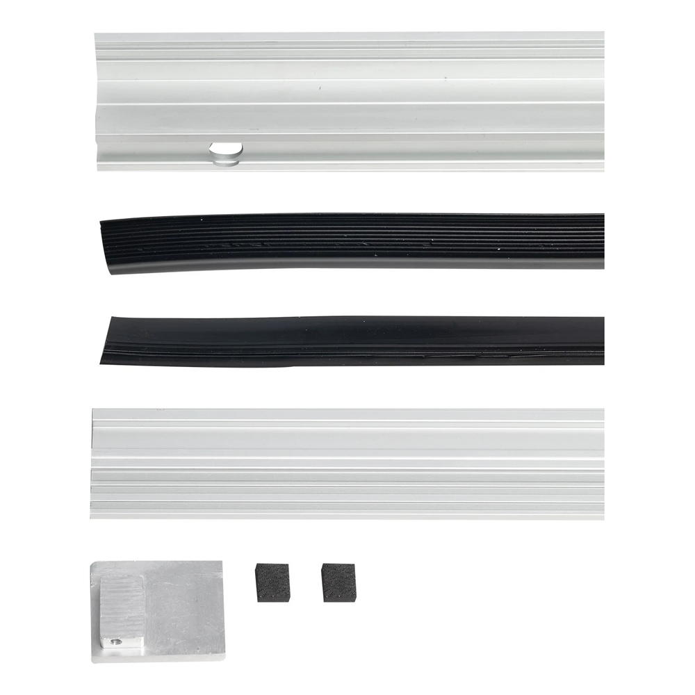 Obrázky nižšie predstavujú jednotlivé etapy skladania súpravy: od rozloženia komponentov, cez zasunutie tesnenia do profilu (zelené značky ukazujú body uchytenia), až po hotovú, zloženú súpravu.