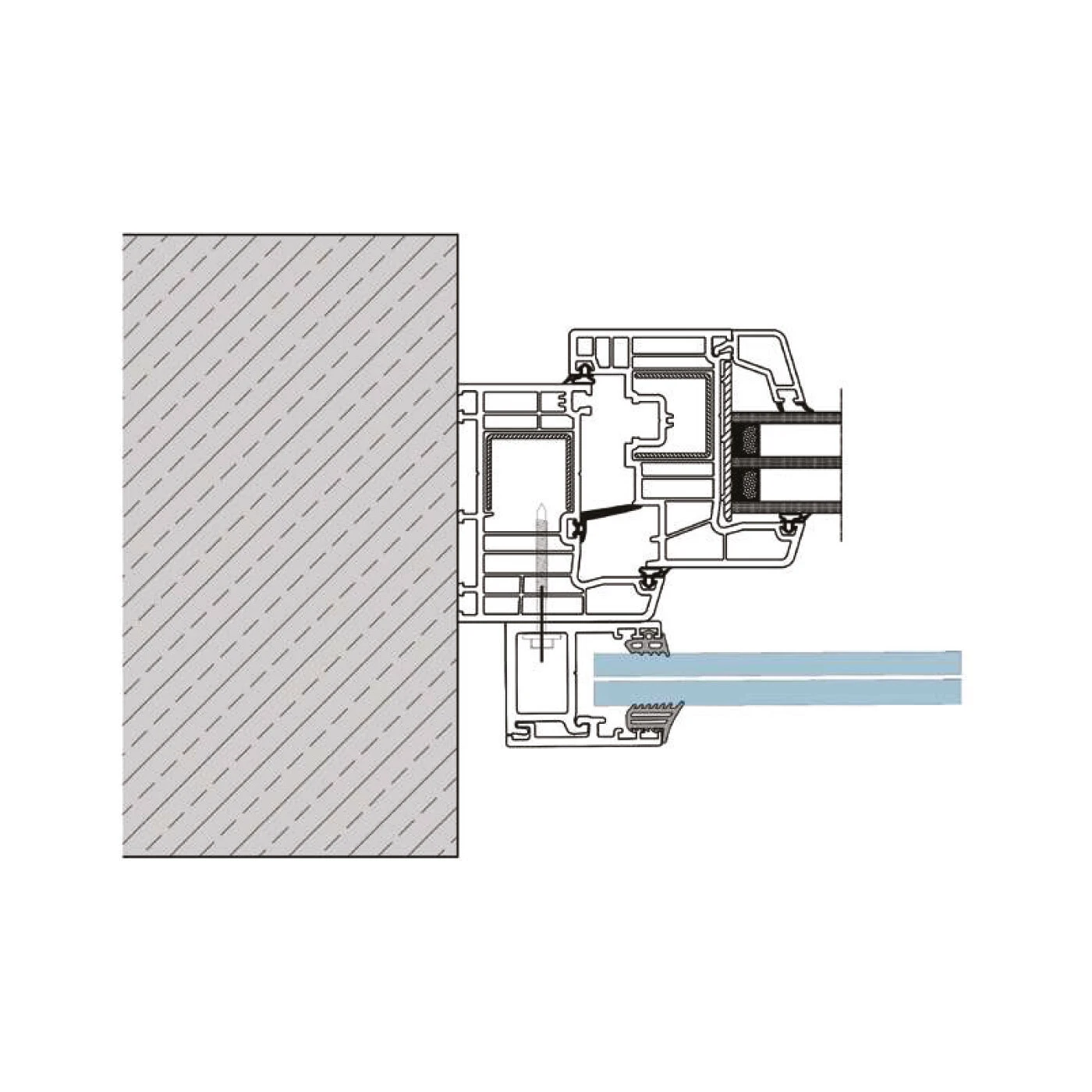 Výkres prierezu ukazuje detail spojenia hliníkového profilu s okenným rámom a zárubňou. Profil sa uchytáva priamo na okno — bez zásahu do konštrukcie steny. Systém zabezpečuje estetické dokončenie z vonkajšej strany vďaka maskovniciam a tesneniu na sklo.