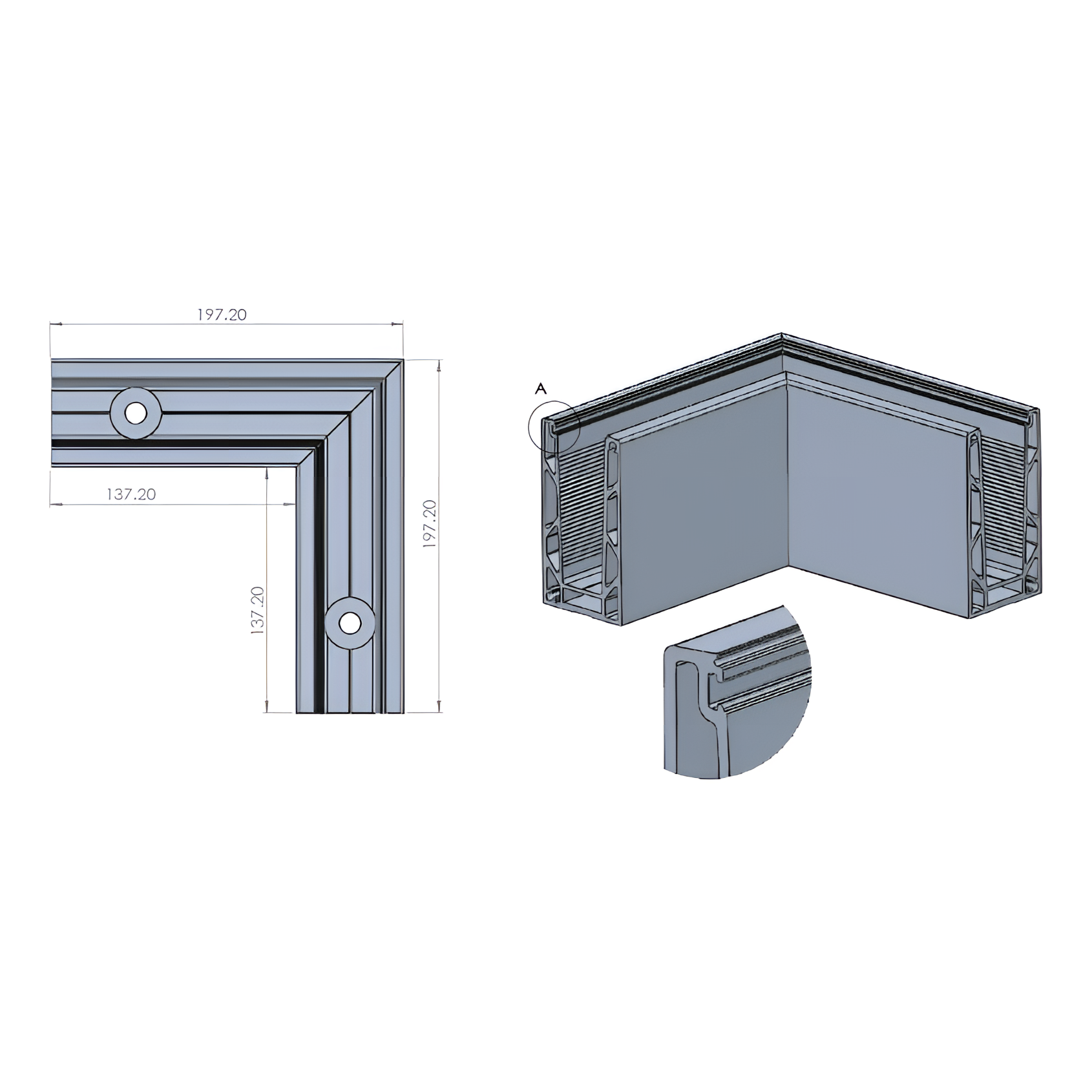 Profil je vyrobený z hliníka EN AW 6063 — zliatiny s priaznivým pomerom hmotnosti k tuhosti, odolnej proti korózii po správnom povrchov dokončení. Tmavosivé lakované v farbe RAL 7021 dokonale harmonizuje s moderným hliníkovým stolárstvom, fasádami z architektonického betónu aj drevenými dokončeniami, spĺňa technické požiadavky aj vysoké estetické očakávania projektantov a investorov.