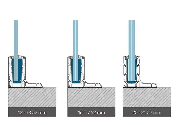 Profil KE 105 spolupracuje s tromi rozsahmi hrúbky skla, čo umožňuje prispôsobenie rôznym statickým a projektovým požiadavkám: