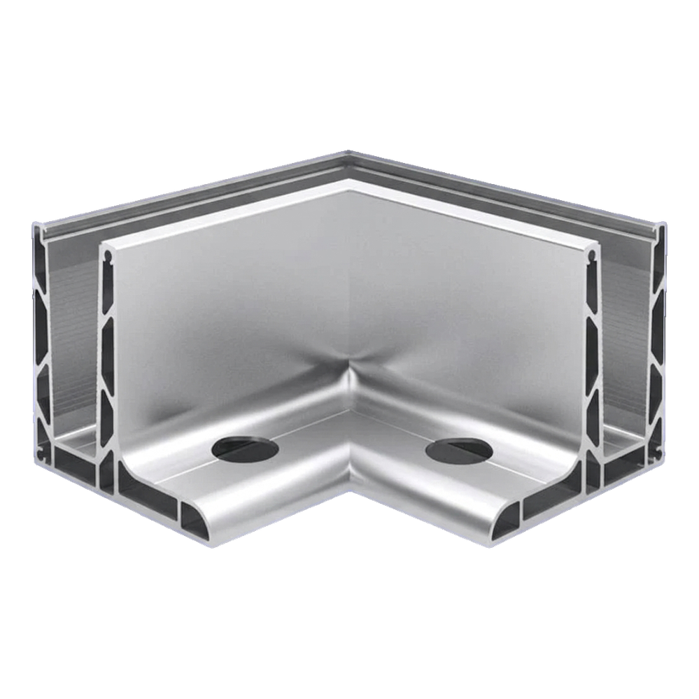 Rohový profil L 90° Kozza KE 105 je konštrukčný prvok určený na budovanie celosklenných zábradlí v plochom systéme. Profil slúži na spájanie dvoch sklenených tabúľ pod pravým uhlom vo vonkajších rohoch, zabezpečujúc pevné a estetické spojenie bez viditeľných kotevných prvkov zo strany čelnej plochy.