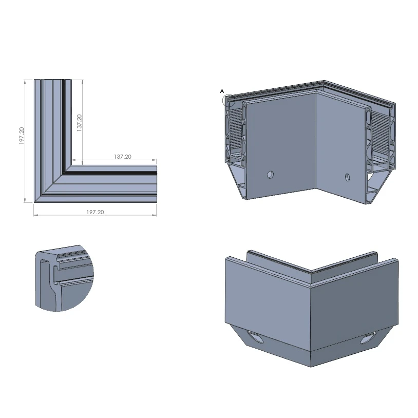 Rohový profil vonkajší KE 120 je určený pre systémy celosklených zábradlí, v ktorých sa sklenené tabule osádzajú priamo do U profilu bez dodatočných bodových držiakov. Vďaka bočnému upevneniu sa prvok montuje na bočnú plochu nosnej konštrukcie, čo umožňuje dosiahnuť čistú líniu zábradlia z vonkajšej strany. Symetrické ramená s dĺžkou 197 mm zaisťujú stabilnú podporu skla na oboch stranách rohu. Profil spolupracuje s ostatnými prvkami série KE 120 značky Kozza — rovnými profilmi, vnútornými rohmi a príslušenstvom — vytvárajúc ucelený, kompletný zábradlový systém.