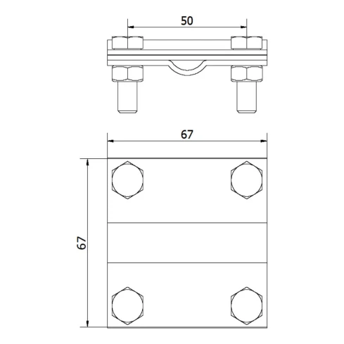 Rozmery spojky sú 67 × 67 × 50 mm, čo zabezpečuje solidnú konštrukciu pri zachovaní plnej funkčnosti. Označenie B v názve produktu sa vzťahuje na maximálnu šírku pásoviny, ktorú možno v spojke upevniť.