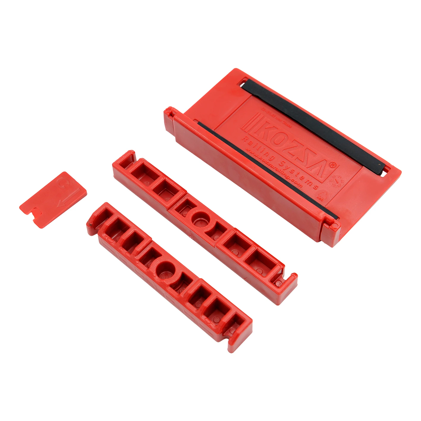 Súčasťou sady sú špeciálne plastové montážne prvky, ktoré zabezpečujú spoľahlivé a opakovateľné polohovanie skla po celej dĺžke profilu. Každá sada pozostáva z hlavného stabilizačného prvku, dvoch bočných vodiacich lišt a poisťovacieho klipsu — celkovo 20 kompletov v balení, čo postačuje na obsluhu profilu s dĺžkou 5 metrov.