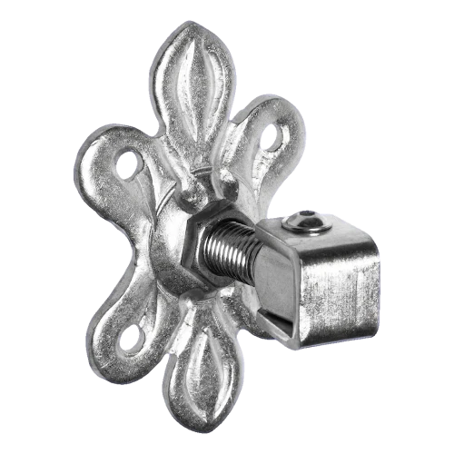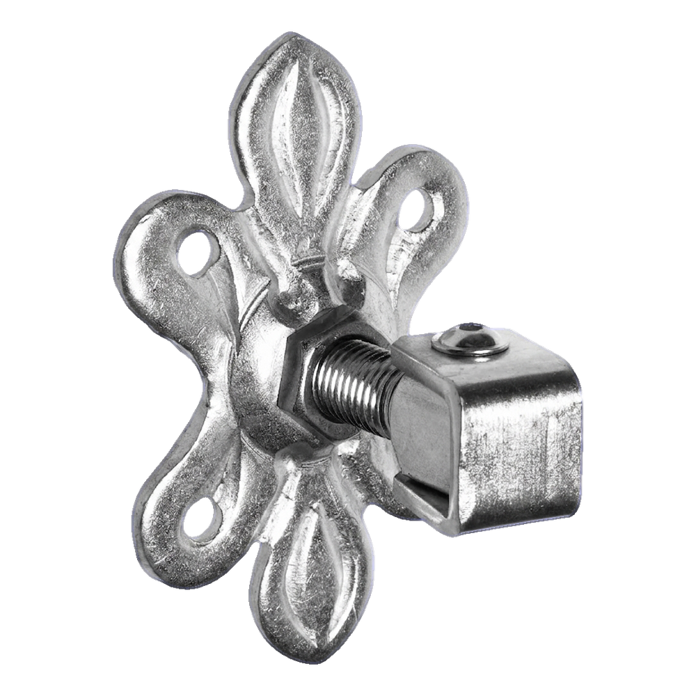 Ozdobný štít v tvare heraldickej ľalie dodáva závesu estetický, dekoratívny charakter — ideálny pre brány a bránky, kde sa počíta nielen s trvanlivosťou, ale aj s výzorom kovaní. Štyri montážne otvory v štíte zabezpečujú stabilné a rovnomerné rozloženie zaťaženia na povrchu stĺpika alebo krídla.