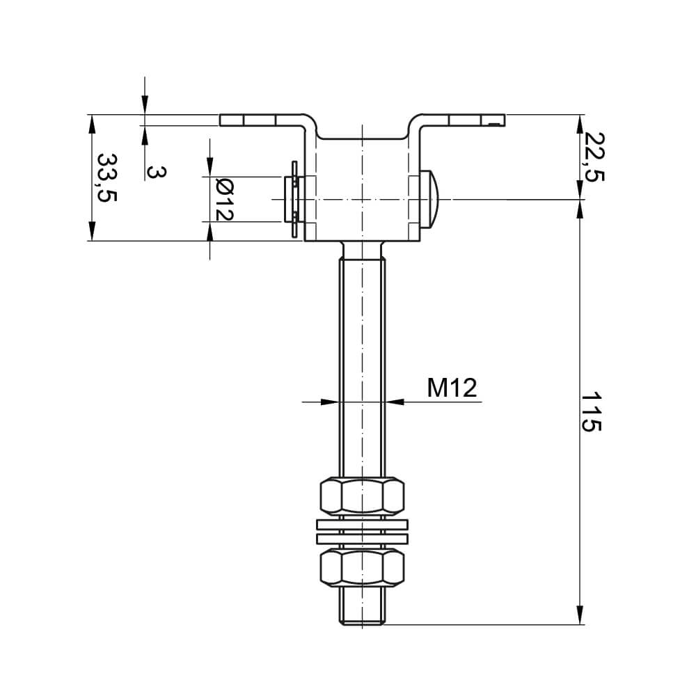 Nastaviteľný pant M12 ohýbaný je odolný kovaný prvok určený na montáž krídlových brán a vrátok. Oceľová konštrukcia so závitovou osou M12 s pracovnou dĺžkou 115 mm zabezpečuje precízne nastavenie polohy krídla po ukončení montáže — bez nutnosti demontáže pantu. Ohýbaná základňa s dvoma montážnymi otvormi v tvare fazule umožňuje spoľahlivé a rýchle priskrutkovanie k stĺpu alebo rámu.