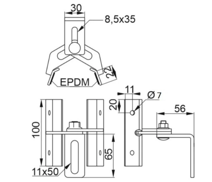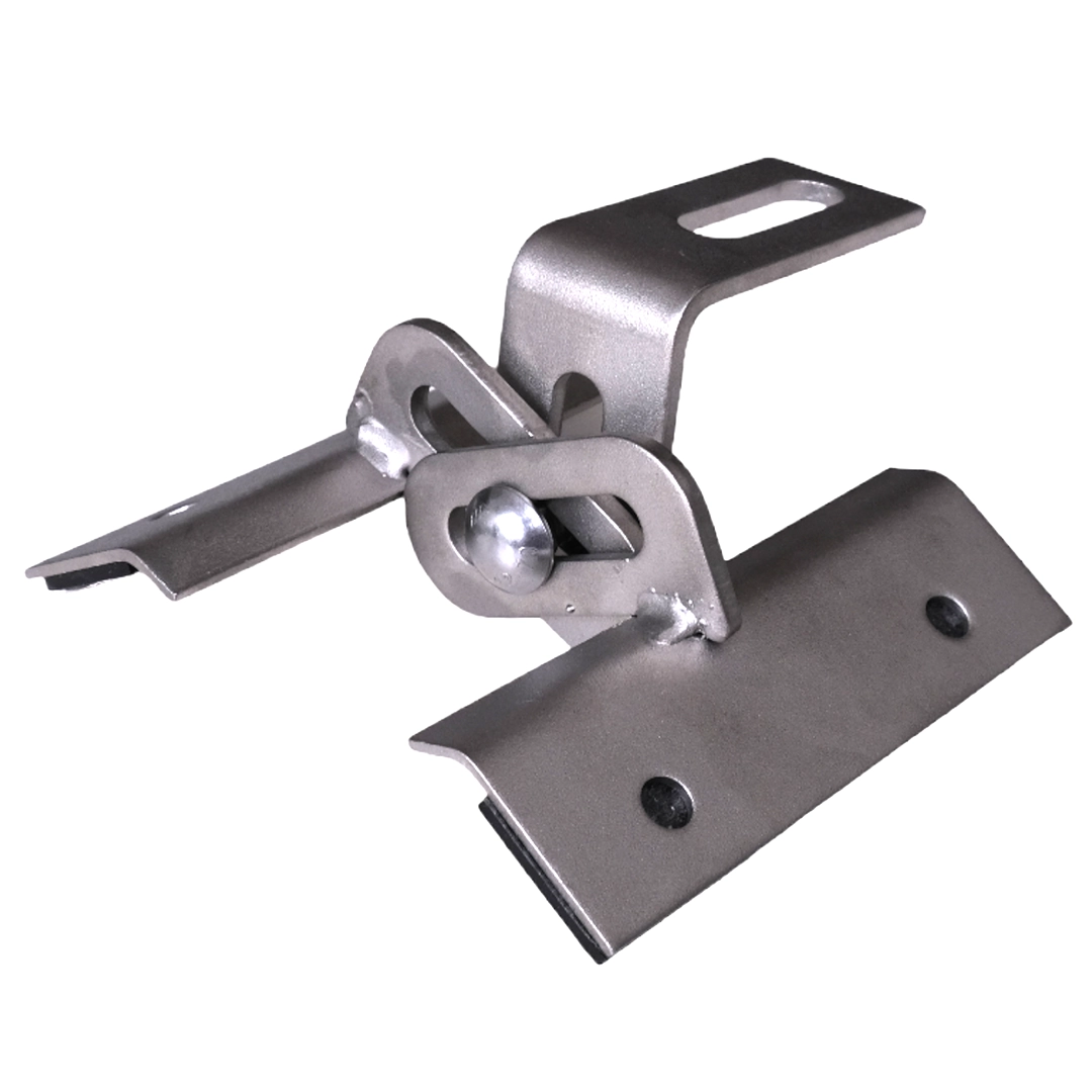 Nastaviteľný držiak na trapézový plech. Určený na montáž profilov fotovoltaických systémov na kovových strechách so stojatou drážkou. Umožňuje rýchlu montáž bez nutnosti odkrývania krokví a bez narušenia konštrukcie strechy.