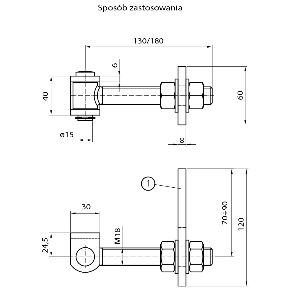 Spojovník sa montuje na krídlo brány alebo branky, a čap závesu M18 prechádza cez lukovitý otvor a je upevnený maticami na oboch stranách. Schéma použitia ukazuje dva varianty dĺžky čapu (130 mm alebo 180 mm), čo umožňuje vybrať vhodný záves pre hrúbku stĺpika alebo rámu. Puzdro závesu (výška 40 mm, čap Ø15 mm) sa privarí k stĺpiku, a spojovník s lukovitým otvorom umožňuje plynulú reguláciu nastavenia krídla.
