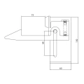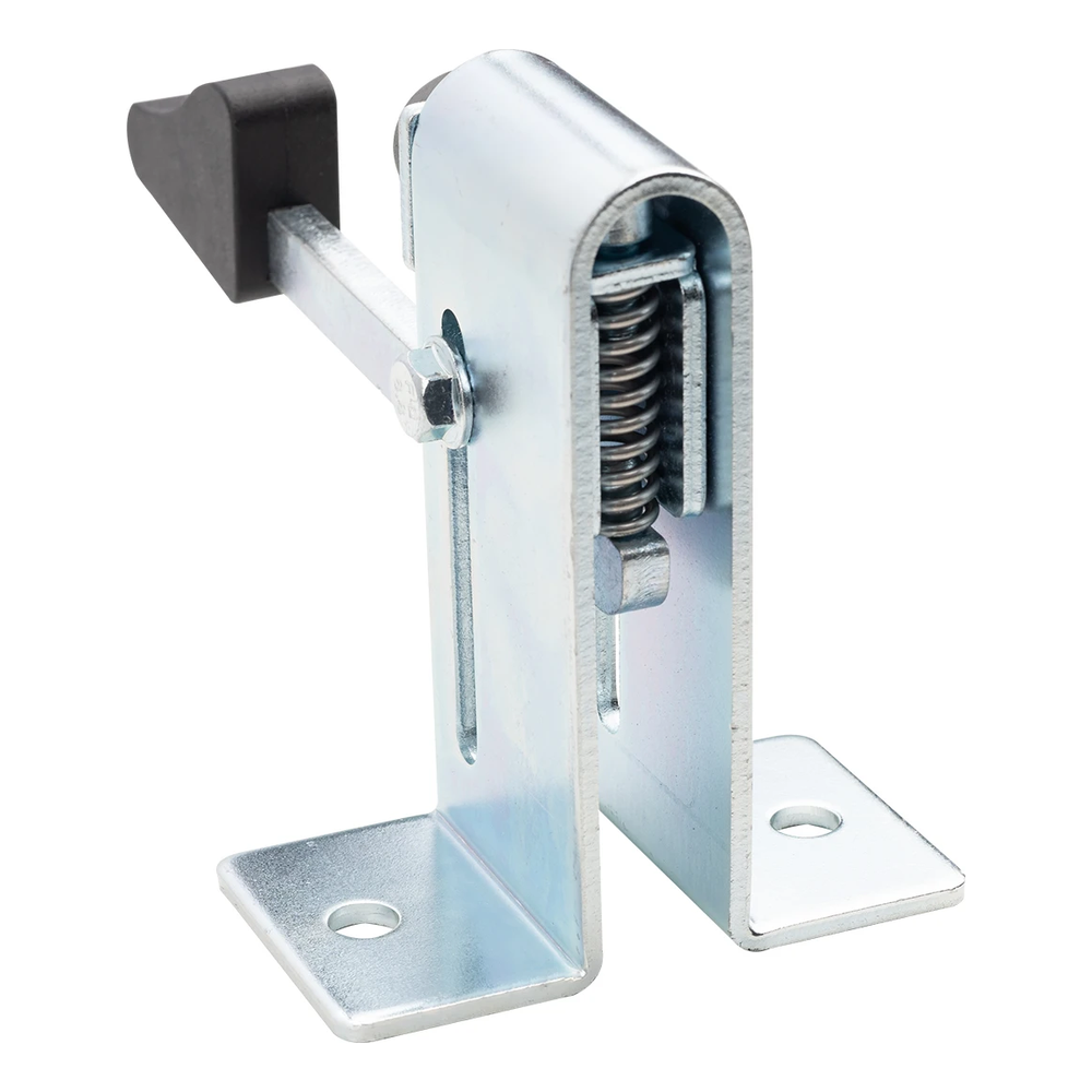 Vnútri korpusu sa nachádza pružinový zapadací mechanizmus, viditeľný na fotografii zo zadnej strany produktu. Oceľový čap sa posúva pozdĺž výrezu v korpuse (rozsah pohybu 68 mm) a pružina ho udržuje v zablokovanej pozícii. Čierny nožný najazd umožňuje intuitívne uvoľnenie blokády — stačí stlačiť nohou, aby sa krídlo brány mohlo voľne zatvoriť.