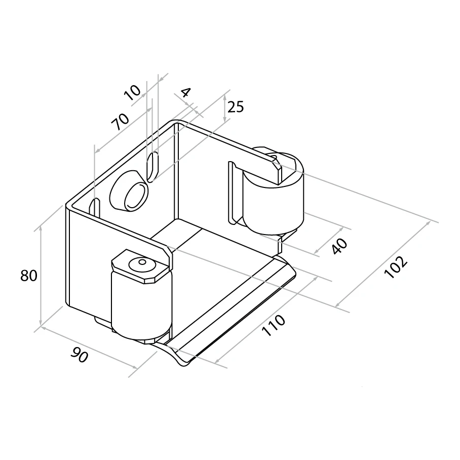 Držiak je kompatibilný s vodiacimi koľajnicami s prierezom 80×80 mm a 70×70 mm. Dve vodiace rolky vyrobené z umelej hmoty zabezpečujú tichý a plynulý chod brány, minimalizujú trenie a opotrebenie koľajnice. Na zadnej stene držiaka sa nachádzajú dva montážne otvory (fazuľky) umožňujúce presné nastavenie polohy a zabudovaný gumový nárazník tlmí náraz krídla brány v zatvorenej polohe.