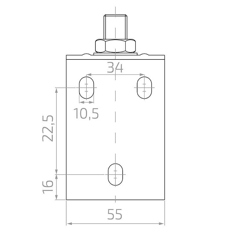 Oceľová konštrukcia podrobená pozinkovaniu garantuje vysokú odolnosť proti korózii a mnohoročnú prevádzku vonku. Držiak sa montuje priamo na stĺpik alebo múr pomocou fazuľkových otvorov v montážnej doske, čo umožňuje presnú reguláciu pozície vo vertikálnom smere. Produkt je určený pre brány ukončené v hornej časti uzavretým profilom rovného tvaru — bez vystupujúcich ozdobných prvkov.