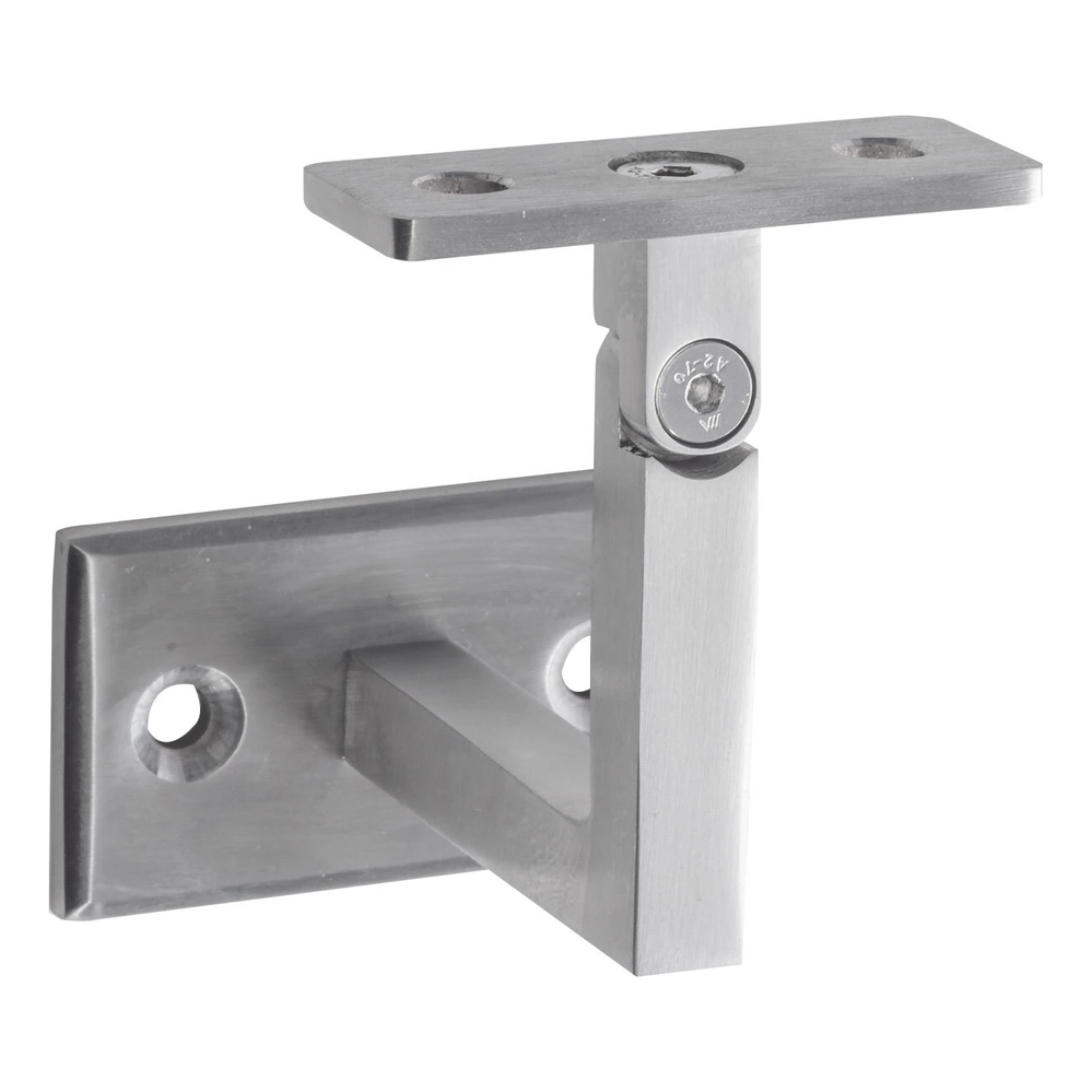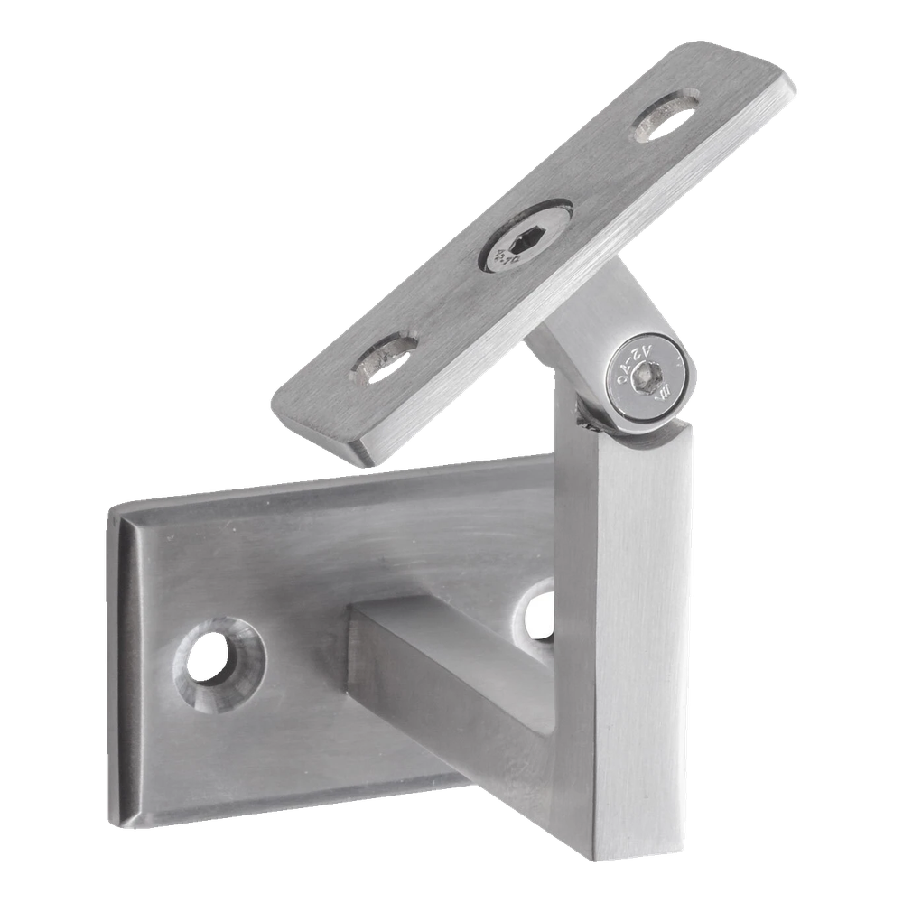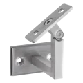 Kĺbový držiak zábradlia na nástenný montáž určený pre profesionálne systémy zábradlí z nerezovej ocele v saténovej povrchové úprave. Vďaka nastaviteľnému kĺbu hornej montážnej dosky držiak umožňuje plynulé nastavenie uhla sklonu zábradlia — riešenie nevyhnutné pri montáži schodiskových zábradlí, kde uhol stúpania schodov vyžaduje presné prispôsobenie.