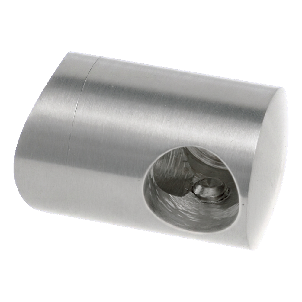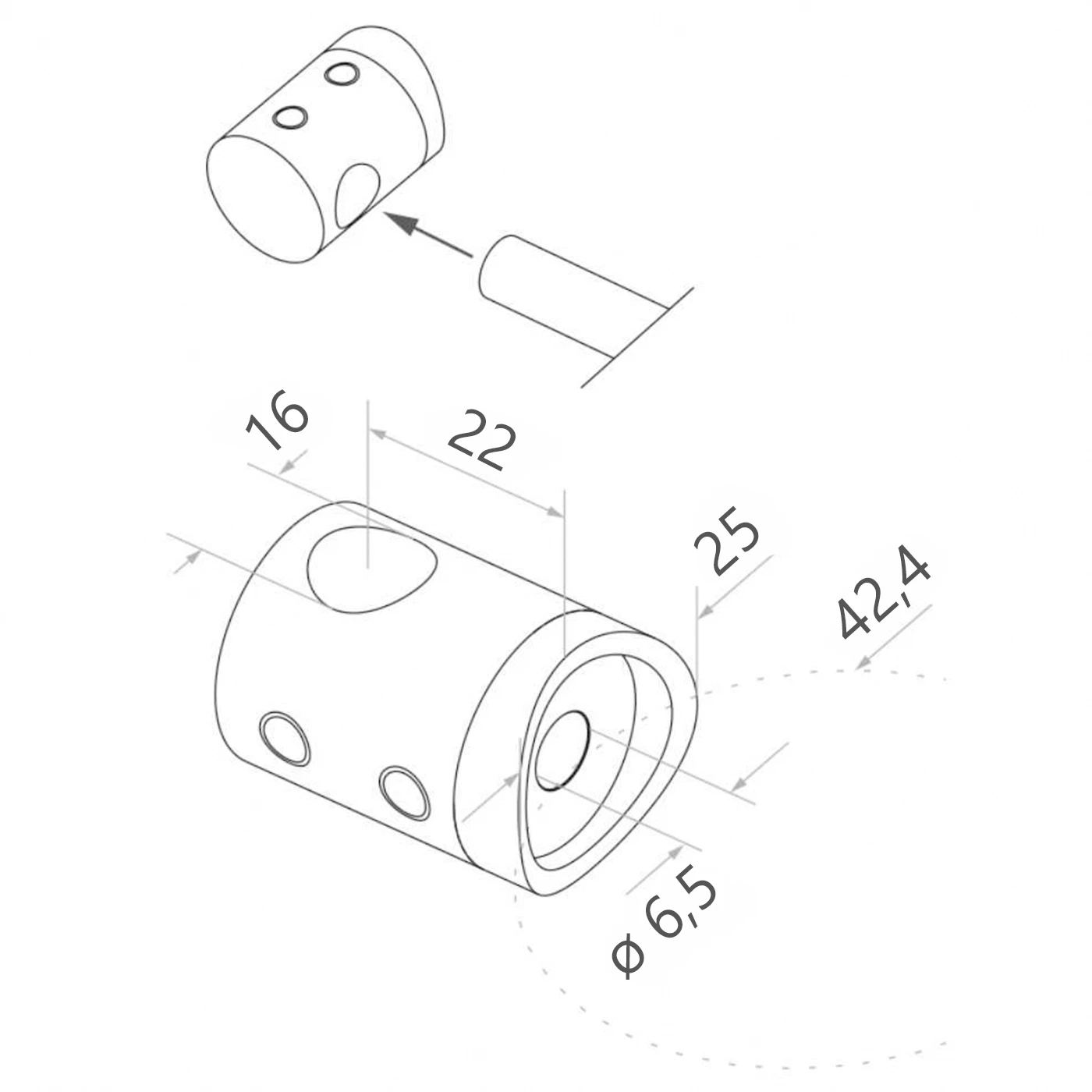 Ľavý koncový (štartovací) držiak určený na montáž tyče s priemerom fi 16 mm na nosnej rúre fi 42,4 mm. Slúži ako počiatočný alebo koncový prvok tyčovej výplne v nerezových zábradliach. Vyrobený z ocele AISI 304 s povrchovou úpravou satén — zabezpečuje vysokú odolnosť proti korózii a estetický, matný vzhľad zhodný so zvyšnými prvkami zábradlového systému 42,4 mm.