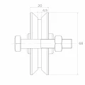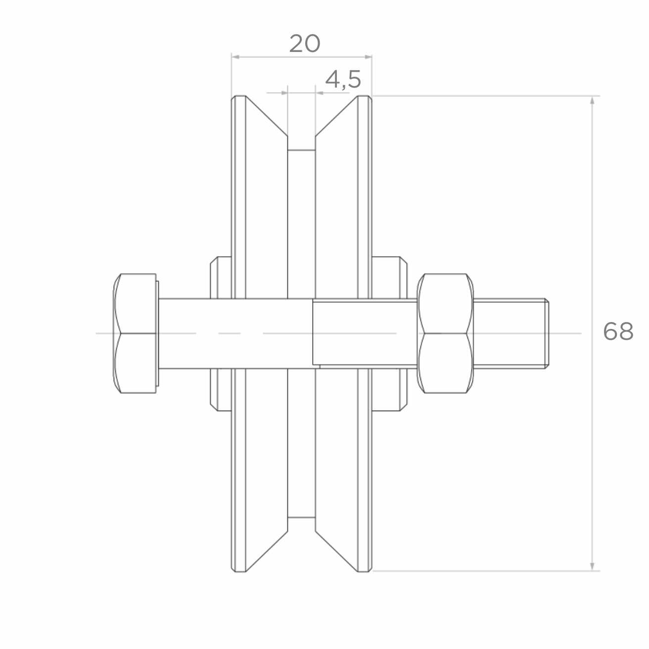 Prierez rolky ukazuje profil drážky V so šírkou dna 4,5 mm, ktorý presne spolupracuje s vodiacou koľajnicou. Rolka s priemerom 68 mm a šírkou 20 mm zabezpečuje optimálny kontakt s koľajnicou, minimalizuje opotrebenie a hluk počas posúvania brány. Guľôčkové ložisko zaručuje nízke odpory valenia aj pri plnom zaťažení.