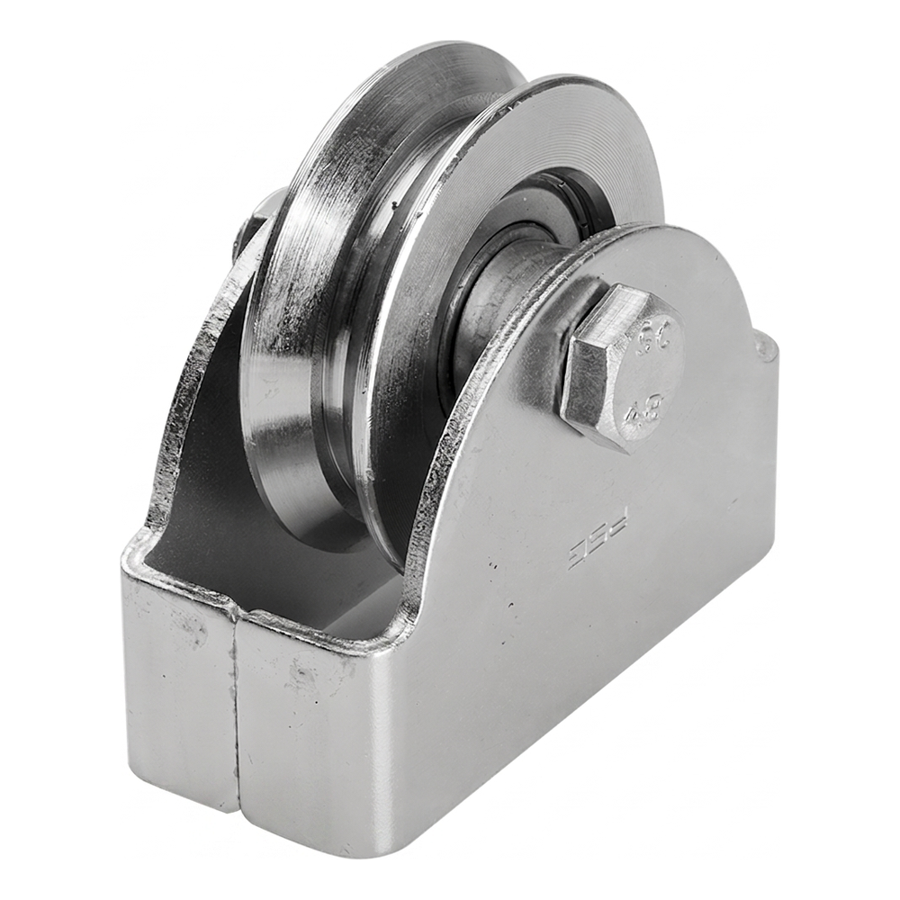 Oceľová jazdná rolka typu V značky PSG určená pre posuvné koľajové brány. Vďaka profilu drážky v tvare písmena V rolka stabilne vedie bránu po koľajnici, zabezpečujúc plynulý a tichý prechod. Komplet obsahuje rolku usadenú v oceľovom montážnom puzdre a upevňovaciu skrutku — po dodaní na stavbu stačí element namontovať priamo na rám brány, čo skracuje čas inštalácie na minimum.