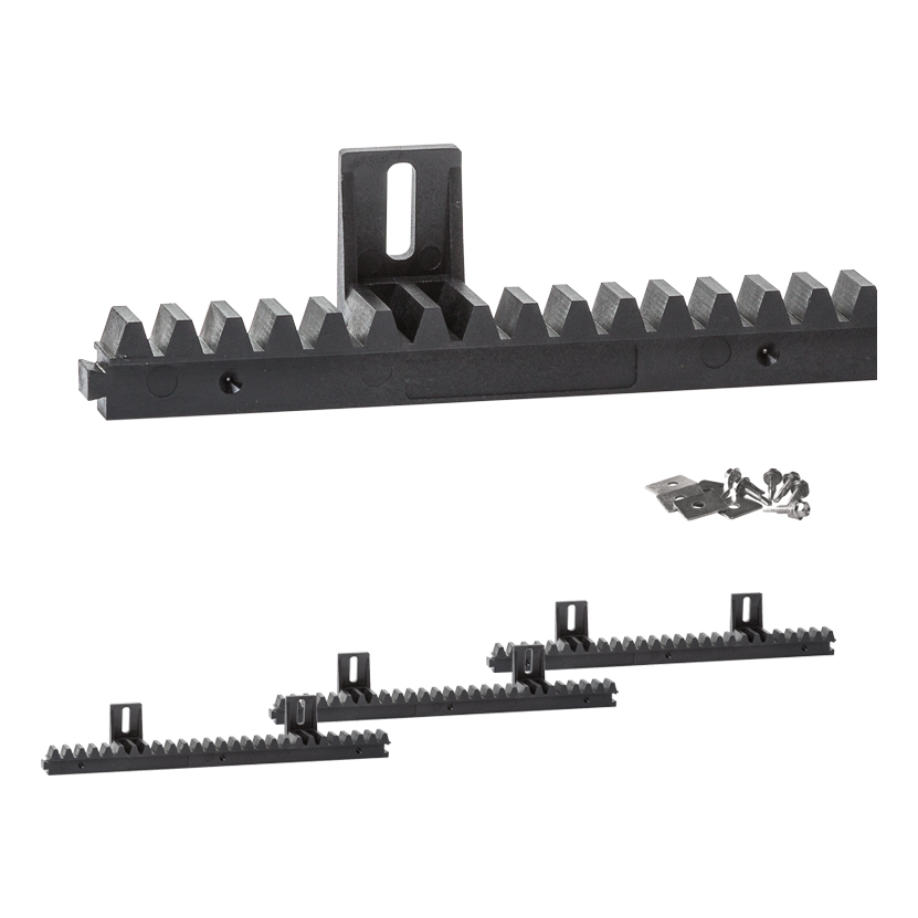 V sade sa nachádzajú tri úseky lišty s dĺžkou 333 mm každý, spájané medzi sebou pomocou zámkov — vďaka tomu získate súvislú líniu ozubnice bez nutnosti presného dorezu. Každý úsek je vybavený dvoma montážnymi držiakmi, ktoré umožňujú rýchle a pohodlné priskrutkovanie lišty ku krídlu brány. K sade sú priložené aj samovŕtacie skrutky s podložkami, čo eliminuje potrebu kompletovať osobné spojové prvky — všetko, čo je potrebné na montáž, je v jednom balení.
