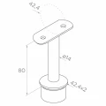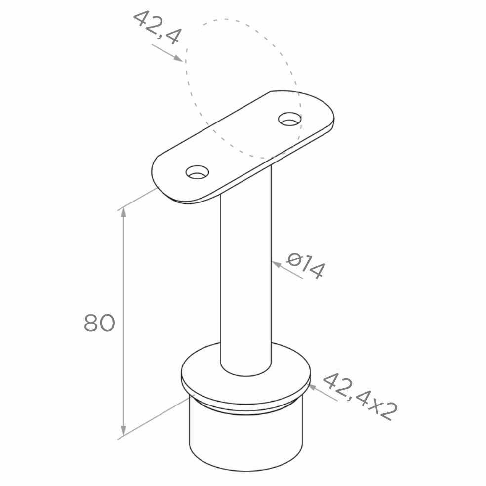 Základňa podpery je prispôsobená k rúre stĺpika s rozmermi 42,4 × 2 mm (vonkajší priemer × hrúbka steny), a sedielko hore prijíma madlo s priemerom 42,4 mm. Kompaktná konštrukcia s výškou 80 mm a čapom ø14 mm zabezpečuje tuhé a stabilné upevnenie madla. Nerezová oceľ AISI 316 garantuje vysokú odolnosť proti korózii — osvedčuje sa tak vo vnútri budov, ako aj vonku, vrátane prostredí vystavených pôsobeniu soli a vlhkosti.