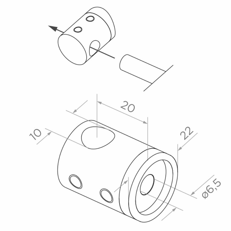 Telo držiaku má tvar valca s priečnym priechodným otvorom pre tyč. Montážny otvor v osi súčiastky umožňuje priskrutkovanie držiaku k plochému povrchu (napr. stĺpik, profil). Montážny pohľad na technickom výkrese ukazuje intuitívny sposôb osadenia tyče do držiaku.