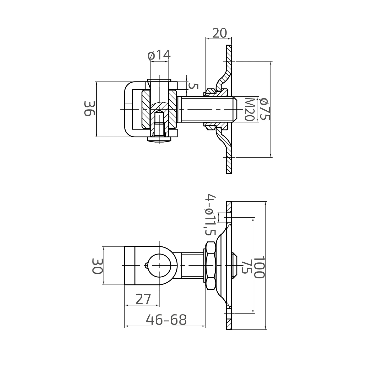 Jednou z kľúčových výhod tohto závesu je plynulá regulácia v rozsahu od 46 do 68 mm (vzdialenosť osi čapu od montážnej roviny). Umožňuje to presné prispôsobenie pozície krídla brány po namontovaní štítku, čo je obzvlášť dôležité pri nerovných stĺpikoch alebo kompenzácii výrobných tolerancií. Závit M20 zabezpečuje solídne a spoľahlivé uchytenie, a štyri montážne otvory o priemere ø11,5 mm v rozstupe 75 mm umožňujú stabilné priskrutkovanie štítku k stĺpiku alebo múru.