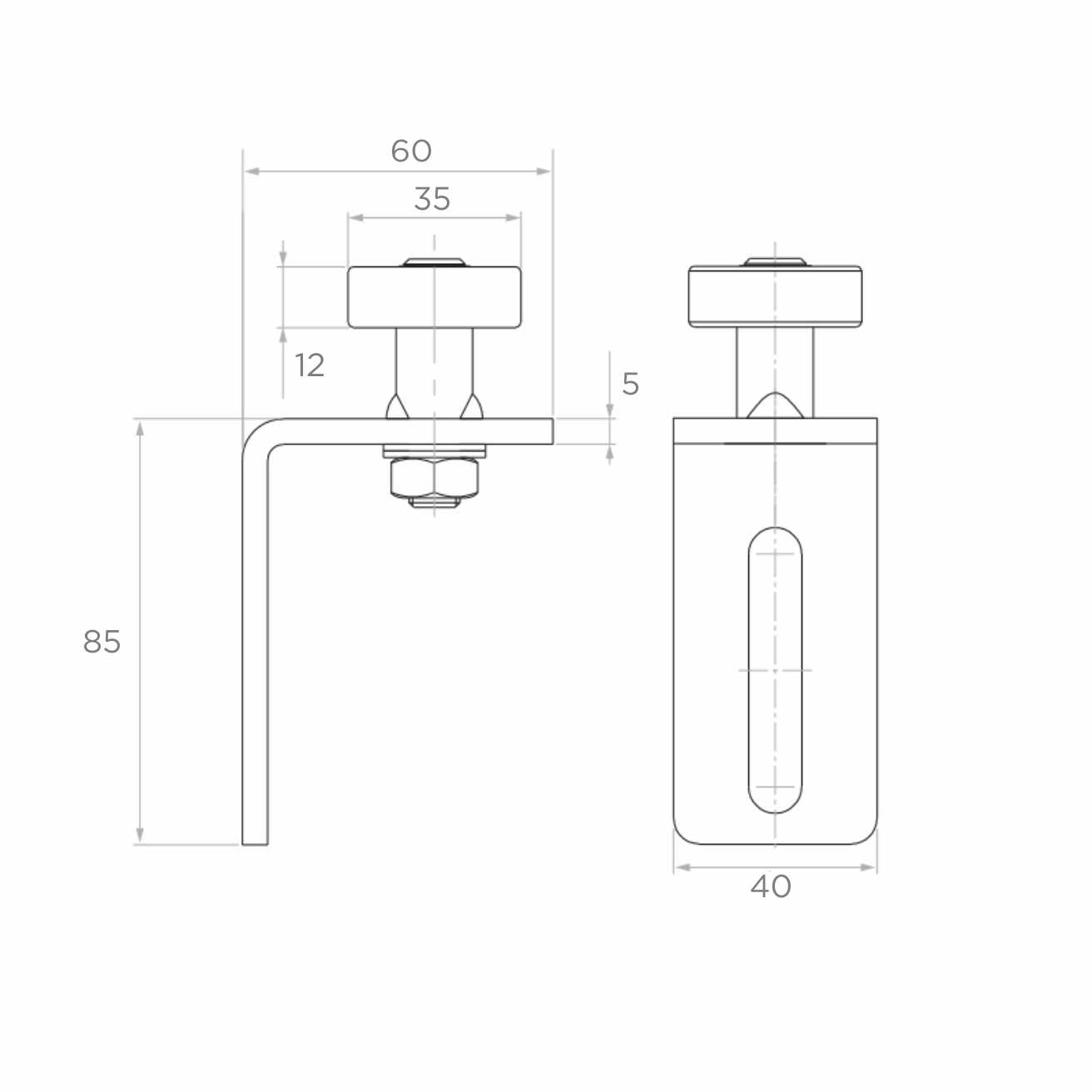 Vodiaca rolka sa montuje na stĺpik posuvnej brány pomocou priloženého uholníka. Zvislé rameno uholníka (85 mm) sa pripevní k stĺpiku, zatiaľ čo vodorovné rameno (60 mm) vystupuje v smere brány, udržiavajúc rolku v osi jazdnej koľaje. Podlhovastý montážny otvor umožňuje presné nastavenie výšky a pozície rolky, čo je obzvlášť dôležité pri vyrovnávaní vodiacieho ceovníka.