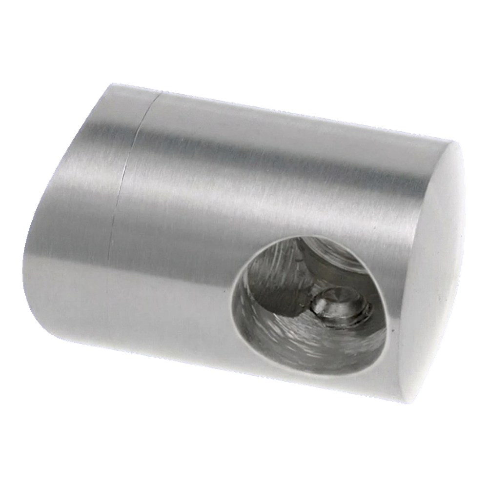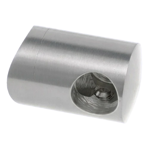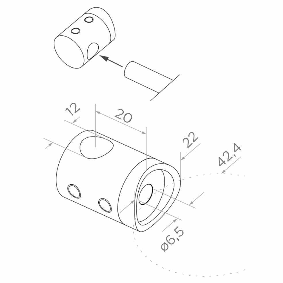 Profilovaná základňa držiaka je presne prispôsobená zakriveniu rúry s priemerom 42,4 mm, vďaka čomu prvok tesne prilieha k stĺpiku a môže byť spoľahlivo upevnený. Kompaktný, cylindrický tvar s vonkajším priemerom 22 mm zabezpečuje diskrétny vzhľad a vizuálne nedominuje nad konštrukciou zábradlia. Bočný otvor s priemerom 12 mm prijíma výplňový prút a montážny otvor fi 6,5 mm umožňuje stabilné spojenie so stĺpikom.