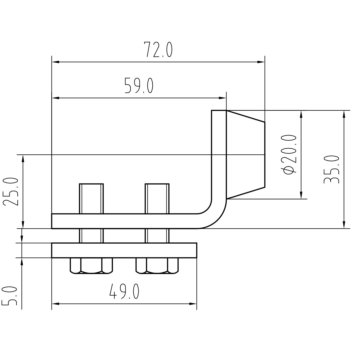 Korpus zarážky má tvar uholníka so svorkovým systémom — dve skrutky pritláčajú dolnú platničku, umožňujúc spoľahlivé upevnenie na profil koľajnice. Nárazník vyrobený z čierneho nylonu tlmí nárazy jazdného vozíka, chrániac tak vozík aj mechanizmus brány pred poškodením. Celý kovový prvok je kompletne pozinkovaný, čo zabezpečuje vysokú odolnosť proti korózii — aj vo vonkajších podmienkach a v prostrediach s povýšenou vlhkosťou.