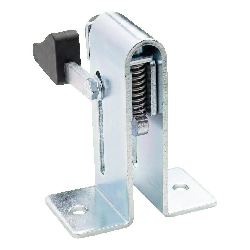 Zabudovaná tlaková pružina automaticky blokuje rameno zarážky v zdvihnutej pozícii. Na uvoľnenie blokády stačí stlačiť čap — jednoduchý a intuitívny systém obsluhy, ktorý nevyžaduje dodatočné náradie. Solidná konštrukcia z pozinkovanej ocele zabezpečuje odolnosť proti korózii a dlhoročnú prevádzku aj v náročných atmosférických podmienkach.